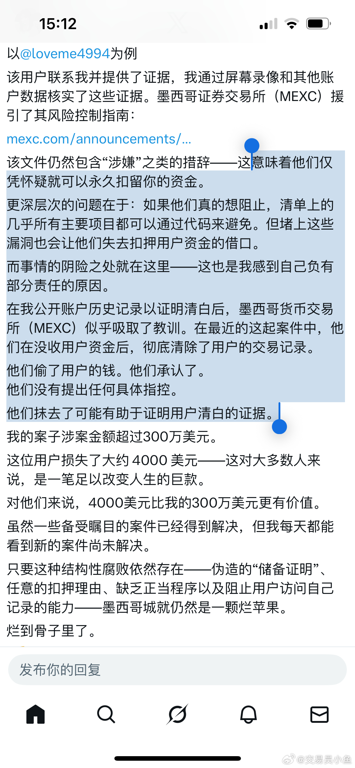 近期用户 的资金被扣、记录被清空,MEXC 仅以“怀疑”为由永久冻结。