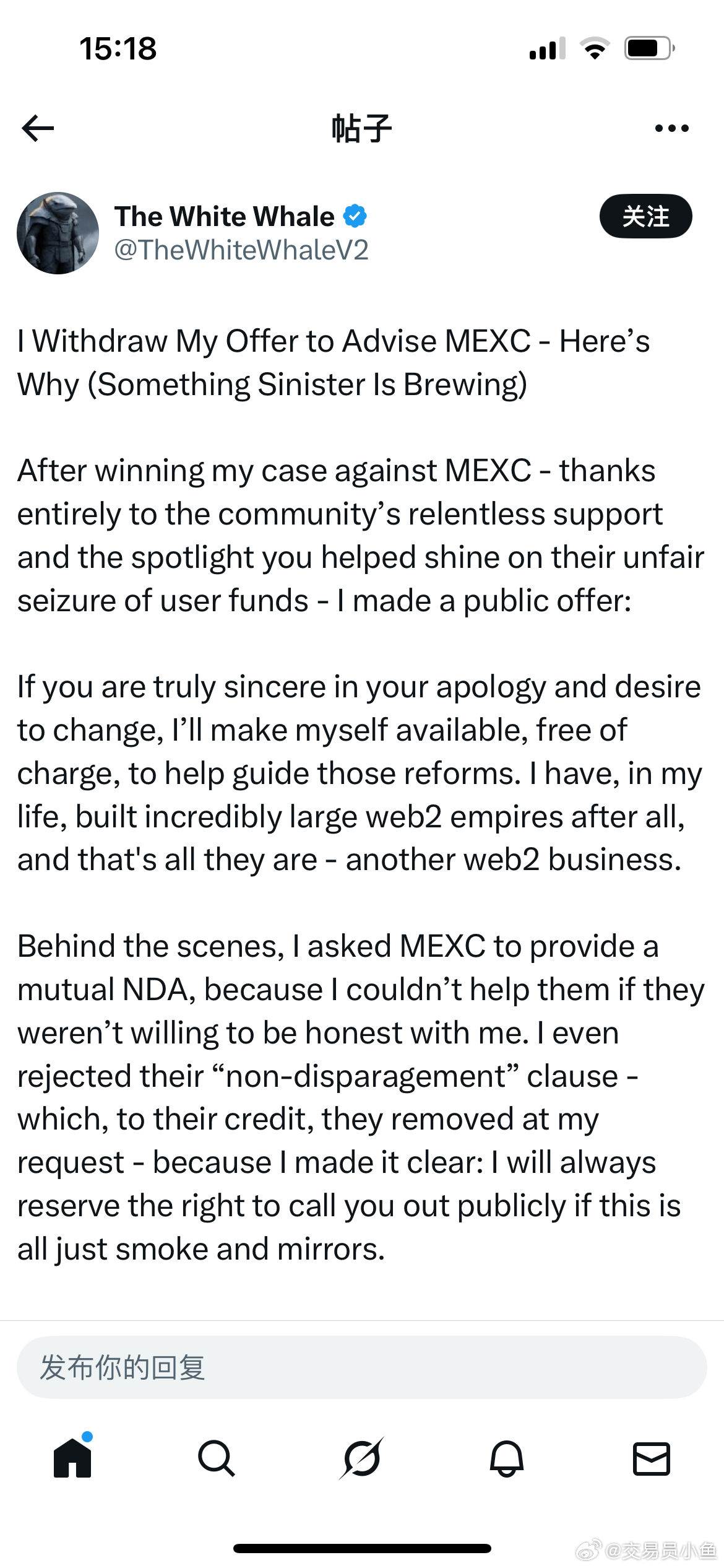 加密圈知名人物 英文区kol White Whale 宣布撤回对 MEXC 的“免费改革顾问”提议。