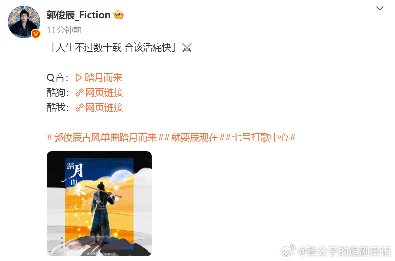 成毅郭俊辰合唱的歌上线了成毅郭俊辰追剧团合唱的《踏月而来》好戳,歌词里全是权如沐的潇洒与遗