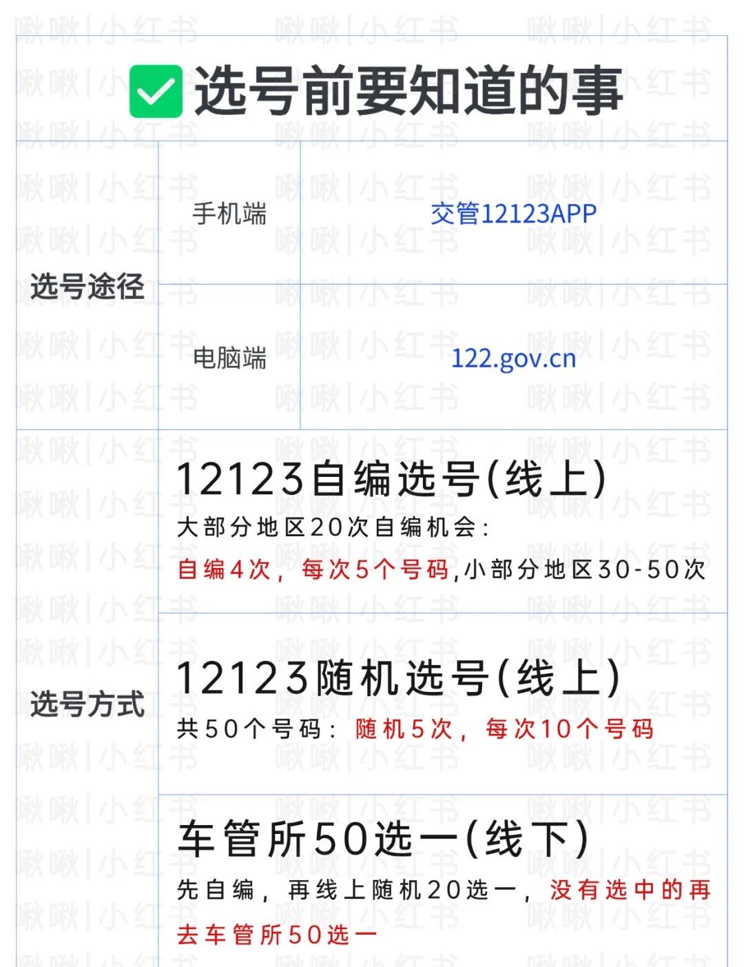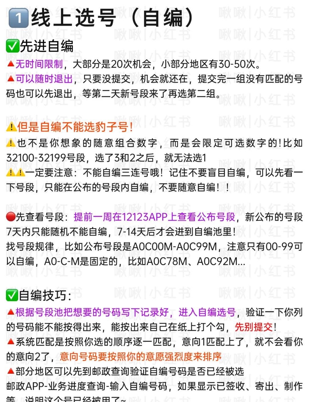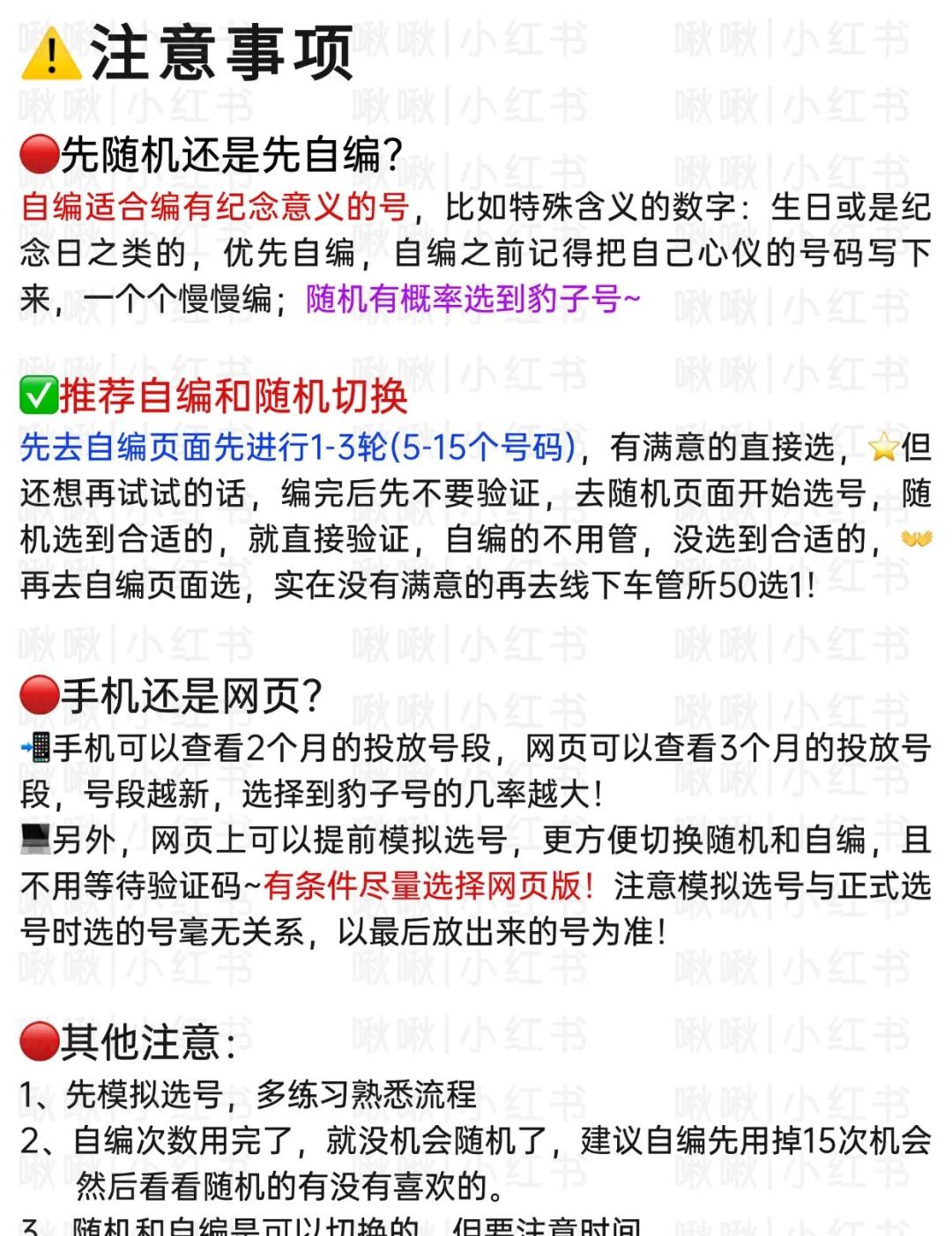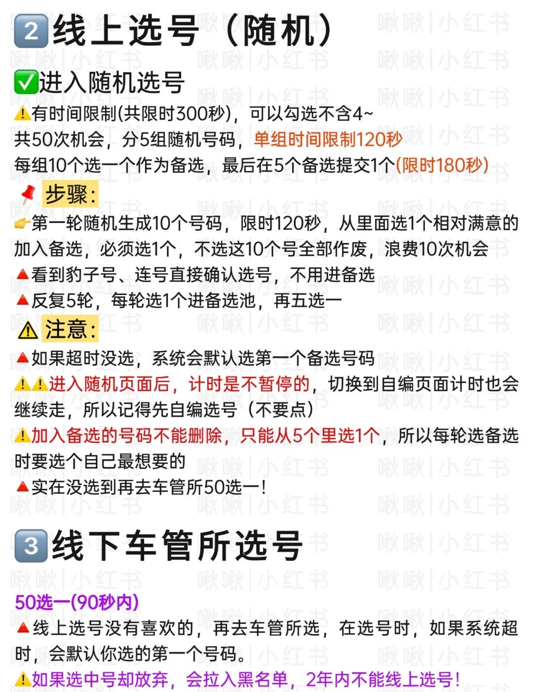 学霸级新车上牌选号!自己也能选到心仪车牌 很多新手买了车不知道怎么选号,千万别听销售说的直接去车管所选号,🥲基本都是怕麻烦,咱自己也可以先在线上选,没有选到合适的再去线下选!这份攻略纷分分钟教你选到豹子号!直接就是拿捏🫴 - 1️⃣选号途径 手机端:交管12123 APP 电脑端:122.gov.cn(更推荐,功能更全) - 2️⃣选号方式&顺序 👉🏻线上自编→线上随机→线下车管所50选一(线上没选中再走线下) 🍀自编:大部分20次(4轮×5个),部分地区30-50次 🍀随机:50个(5轮×10个) 🍀线下:50选一 - 3️⃣开始选号 ✅线上自编 🔺无时间限制,没提交可以随时退出,不消耗机会 🔺在公布号段内编:新号段7天内只能随机,7-14天后开放自编(比如:A0C00M-A0C99M,只有00-99可以修改) ⚠️注意:不能编豹子号、三连号 👉🏻技巧:按意愿排序列出想要的号码清单,部分地区可通过邮政APP查号码是否被占用 - ✅线上随机 🔺限时规则:每轮120秒选1个备选,5轮后180秒从5个备选里确认1个,总计时切换页面也不会暂停 🔺可勾选不含4,没有选则本轮号码作废 🔺看到豹子号/连号直接确认 - ✅线下车管所 🔺90秒内50选一,超时默认第一个号码 🔺线上/线下选中后放弃号码,2年内禁线上选号 - 4️⃣注意事项 🔺先自编15次,再试随机,都没中再走线下车管所选号 🔺网页端可以查3个月号段,支持模拟选号,切换更流畅 🔺提前模拟选号,多熟悉流程不会慌乱 宝藏车知识 汽车知识 车牌选号 新车上牌 遵守交规安全出行 上牌 车牌 汽车知识分享计划 新手买车 选号 转自@一枚探车的啾啾 已授权