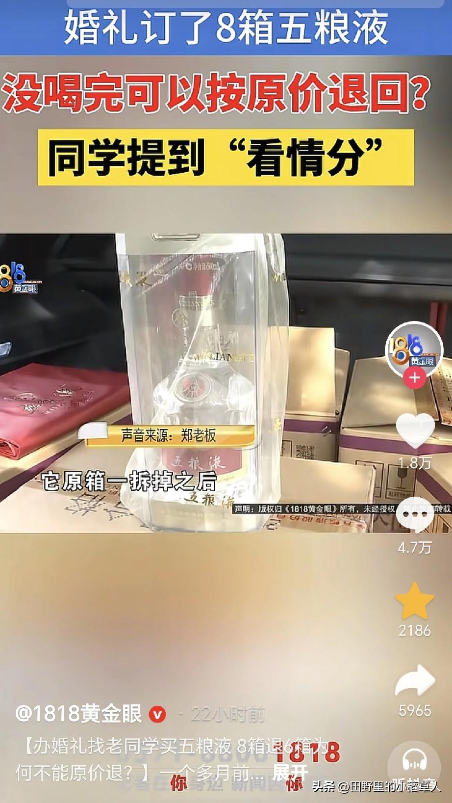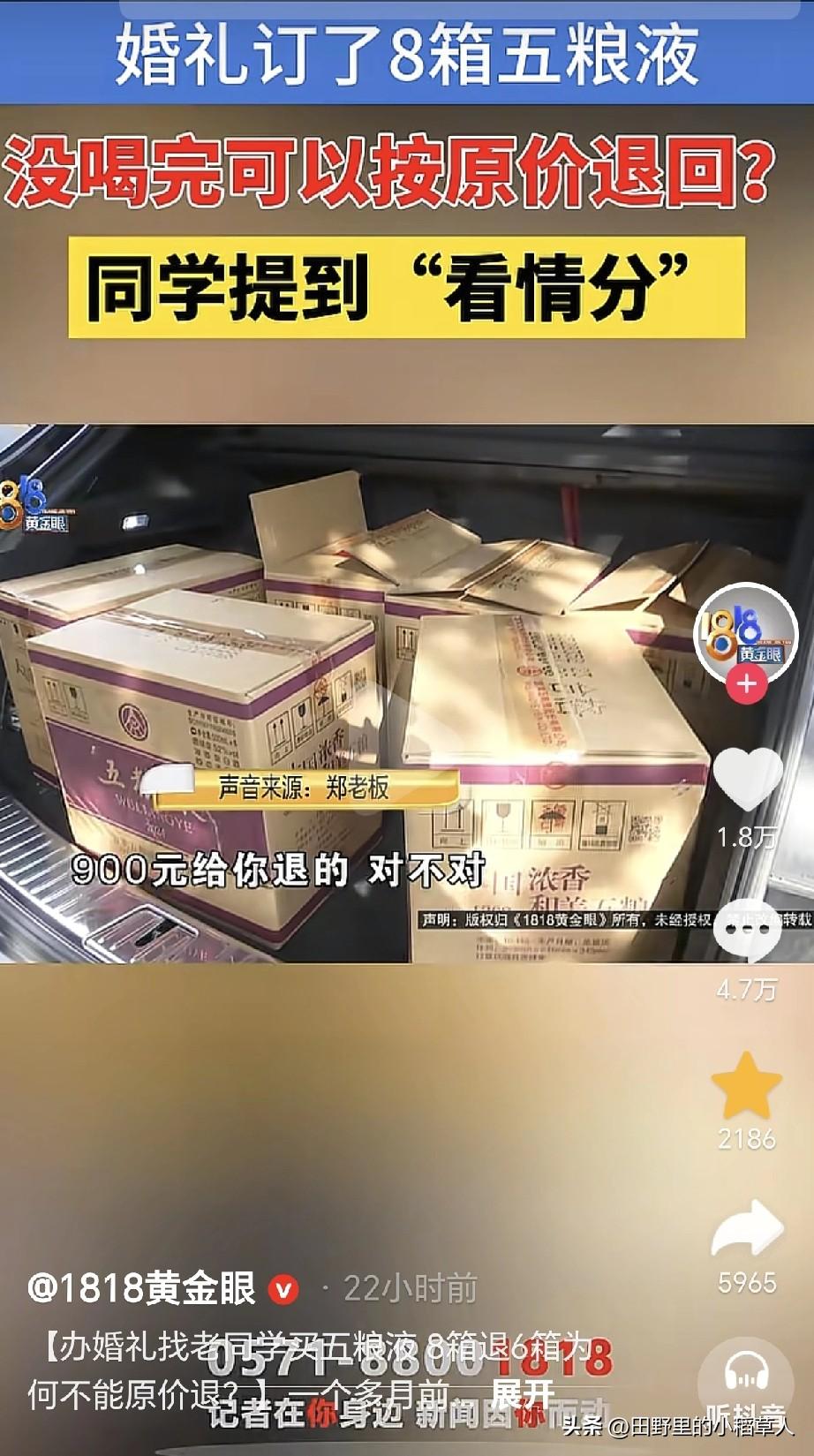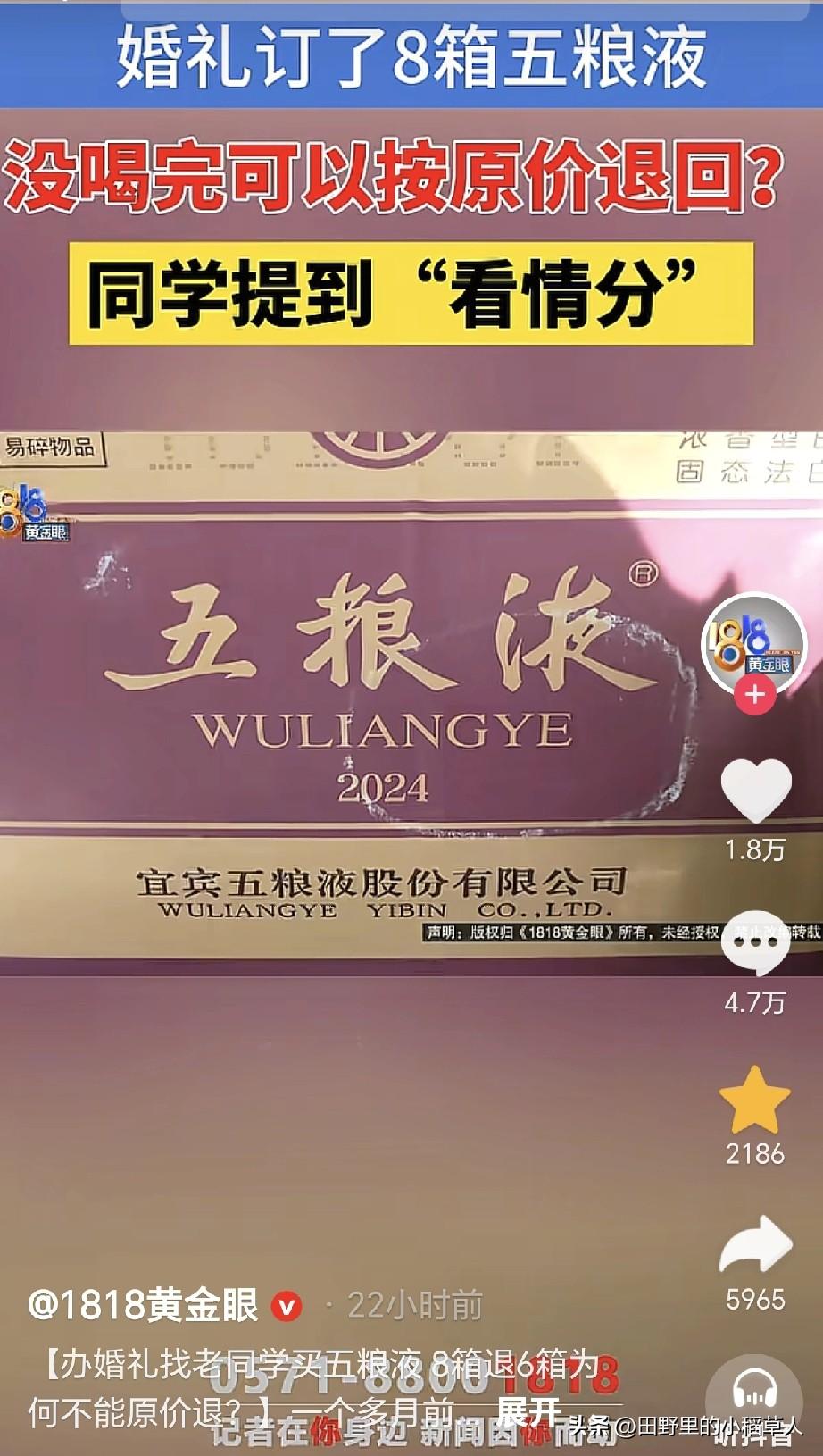 11月8号,浙江宁波一男子接受记者采访说:9月底结婚,因为价格便宜,所以在高中同学那里订了8箱子五粮液,说好剩下之后可以原价退回去,当时每瓶酒900元。 婚礼当天,只喝了2箱子,剩下6箱子,可不喝也要摆桌子上,所以整箱拆开了。等忙完了,去退货,同学认为整箱拆了之后就不能原价退回去了。 说到这里,很多网友也是不理解,整箱拆开,但是单瓶酒包装是好的,这影响销售吗?小编从事烟酒行业多年,在内部有一个词语叫“吹箱酒”。 也就是说,整箱打开之后,纸盒上会有折痕,如图二图三,会被怀疑有造假的可能性,即使是真的,价格也大打折扣,所以不能原价退也合情合理。 目前双方都不肯让步,男子准备去起诉同学,当时说好了,如今还反悔。这件事,一开始都没说明白,估计认为是同学,有面子,好说话,可触碰到利益时,谁也不退步,忘了曾经的友情呀[尬笑]。