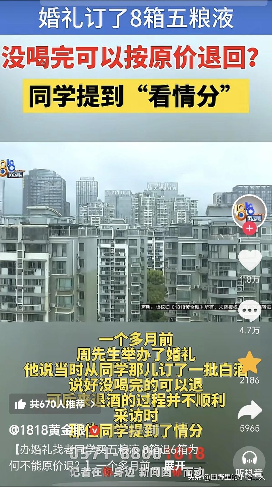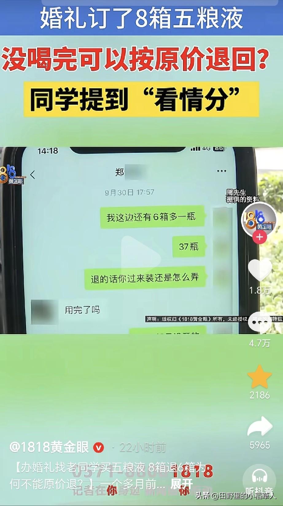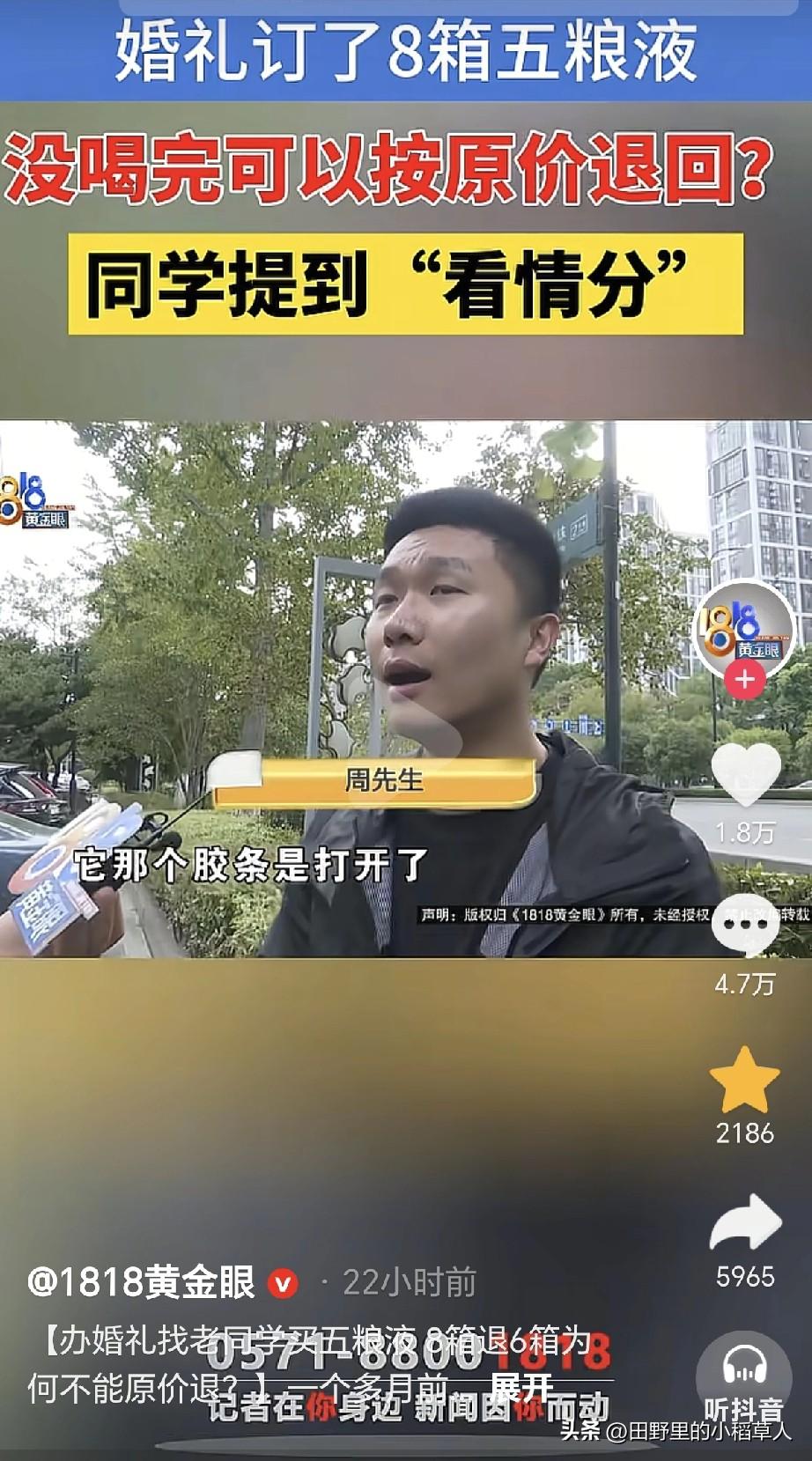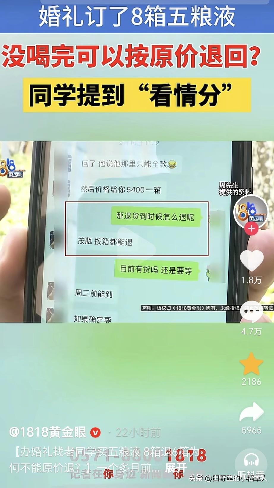 11月8号,浙江宁波一男子接受记者采访说:9月底结婚,因为价格便宜,所以在高中同学那里订了8箱子五粮液,说好剩下之后可以原价退回去,当时每瓶酒900元。 婚礼当天,只喝了2箱子,剩下6箱子,可不喝也要摆桌子上,所以整箱拆开了。等忙完了,去退货,同学认为整箱拆了之后就不能原价退回去了。 说到这里,很多网友也是不理解,整箱拆开,但是单瓶酒包装是好的,这影响销售吗?小编从事烟酒行业多年,在内部有一个词语叫“吹箱酒”。 也就是说,整箱打开之后,纸盒上会有折痕,如图二图三,会被怀疑有造假的可能性,即使是真的,价格也大打折扣,所以不能原价退也合情合理。 目前双方都不肯让步,男子准备去起诉同学,当时说好了,如今还反悔。这件事,一开始都没说明白,估计认为是同学,有面子,好说话,可触碰到利益时,谁也不退步,忘了曾经的友情呀[尬笑]。