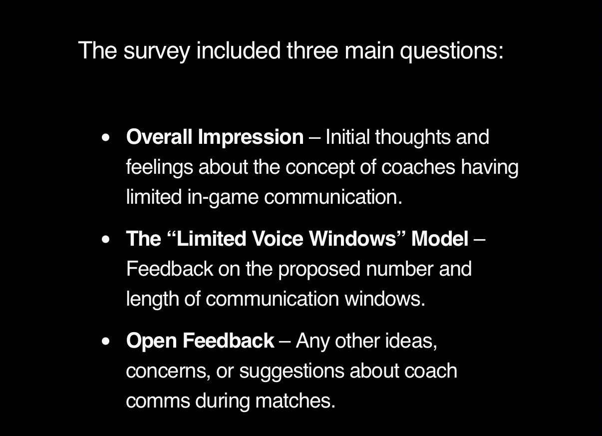 拟议模型将为每支队伍分配指定的「语音窗口」——以每场比赛3个45秒间隔为例,教练可随时启动该窗口。这些窗口的数量和时长仍有待讨论。