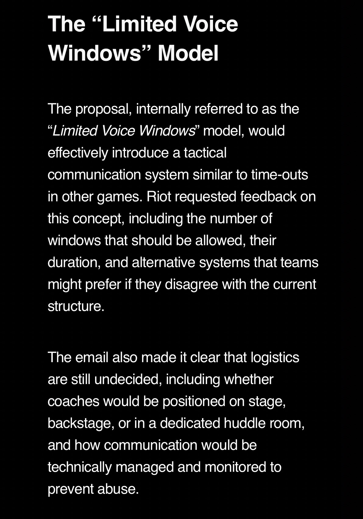 该提案在内部被称为「有限语音窗口」模型,本质上是引入一套类似其他游戏中「暂停战术沟通」的系统。拳头游戏正就这一概念收集反馈,包括可允许的窗口数量、时长,以及若队伍不认可当前架构,可能更倾向的替代方案。