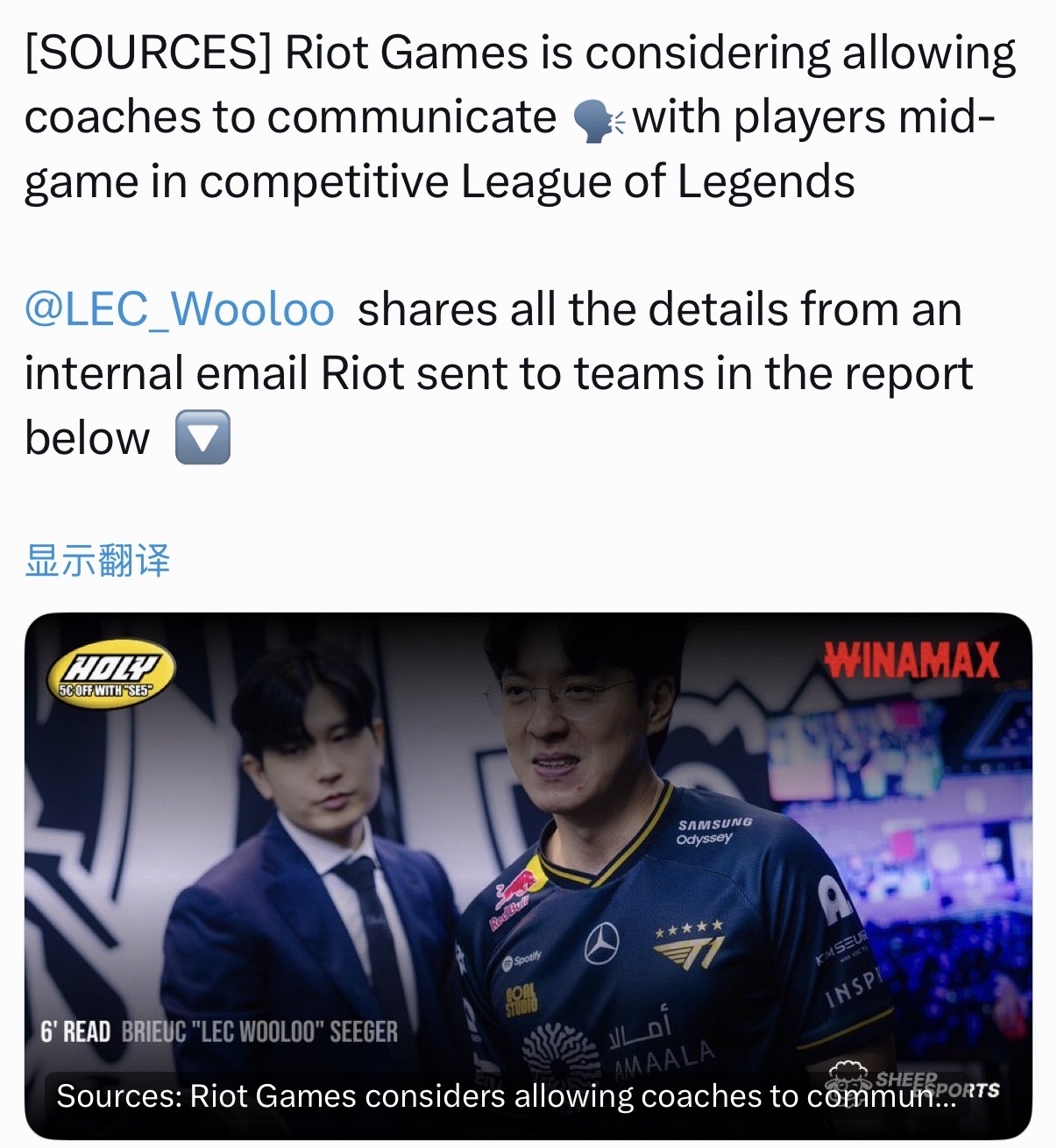 【外媒爆料拳头近期一直在进行意见调查,该变化将允许教练在现场比赛中与选手沟通。】