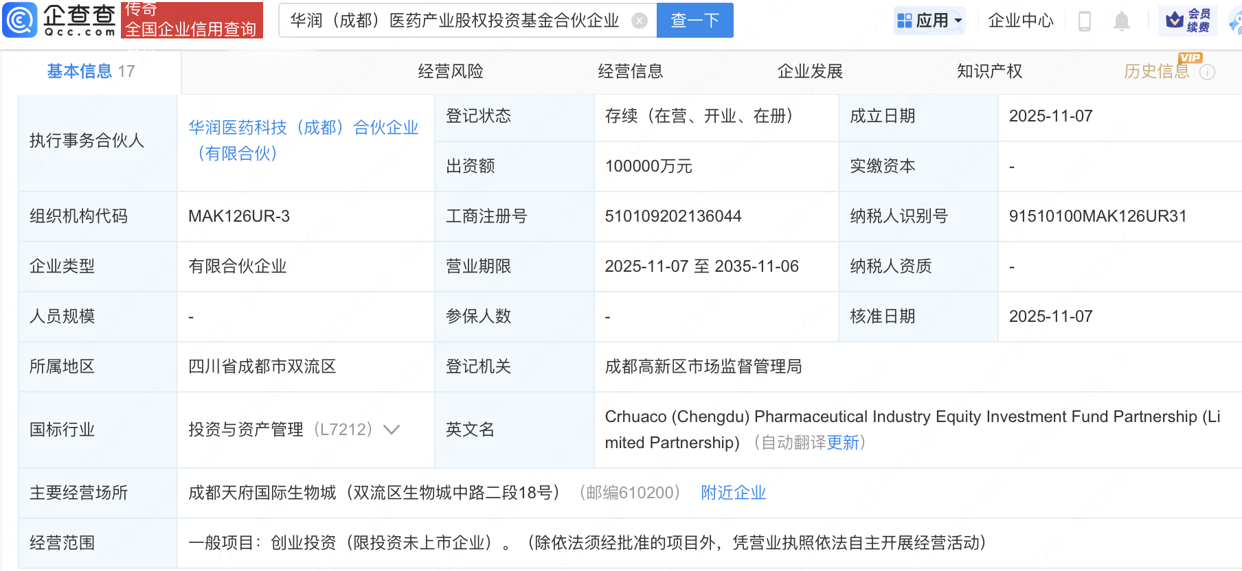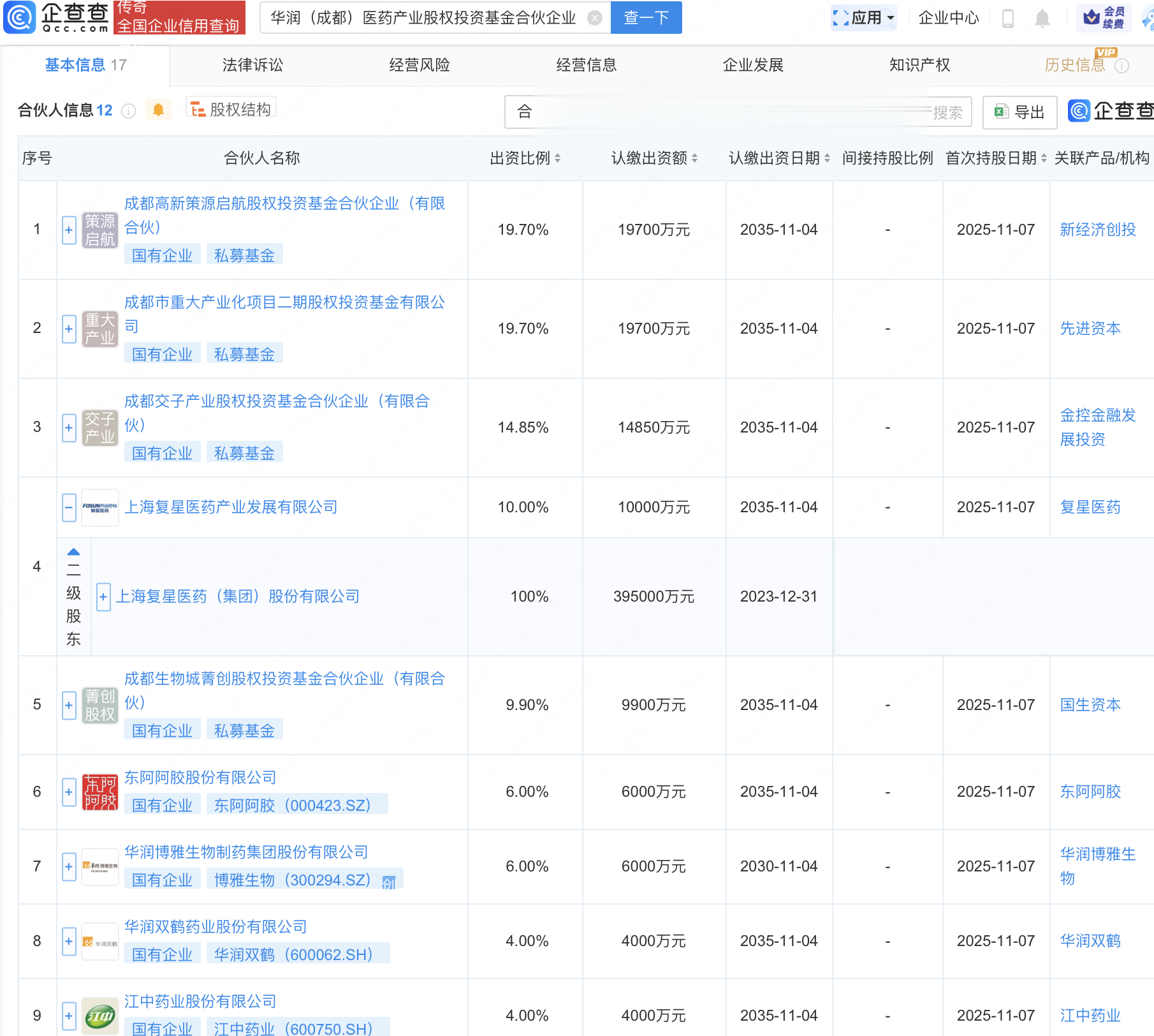 企查查APP显示,近日,华润(成都)医药产业股权投资基金合伙企业(有限合伙)成立,出资额10亿元,经营范围包含:创业投资(限投资未上市企业)。企查查股权穿透显示,该企业由复星医药(600196)全资子公司上海复星医药产业发展有限公司、东阿阿胶(000423)、博雅生物(300294)、华润双鹤(600062)、江中药业(600750)等共同出资。