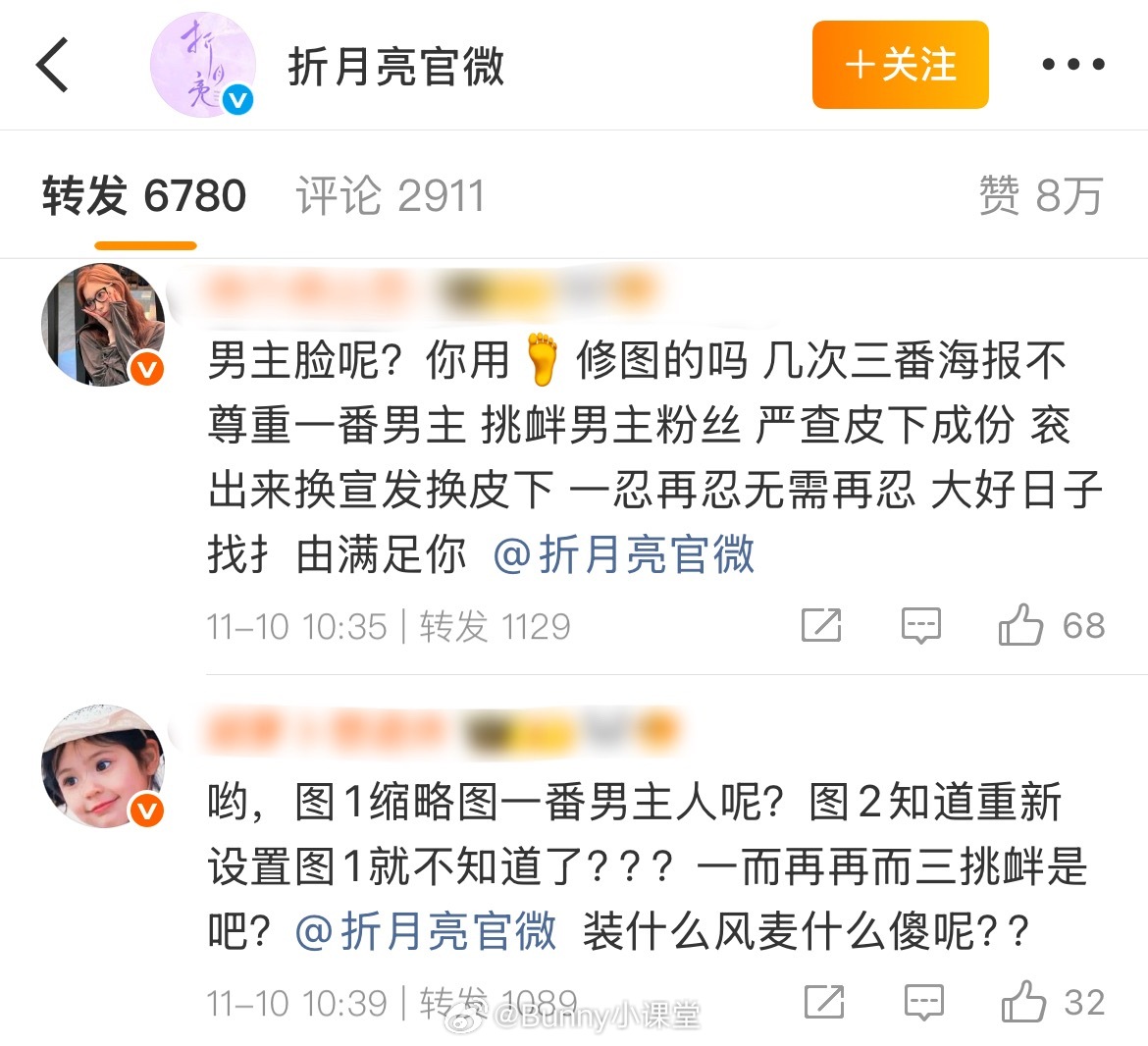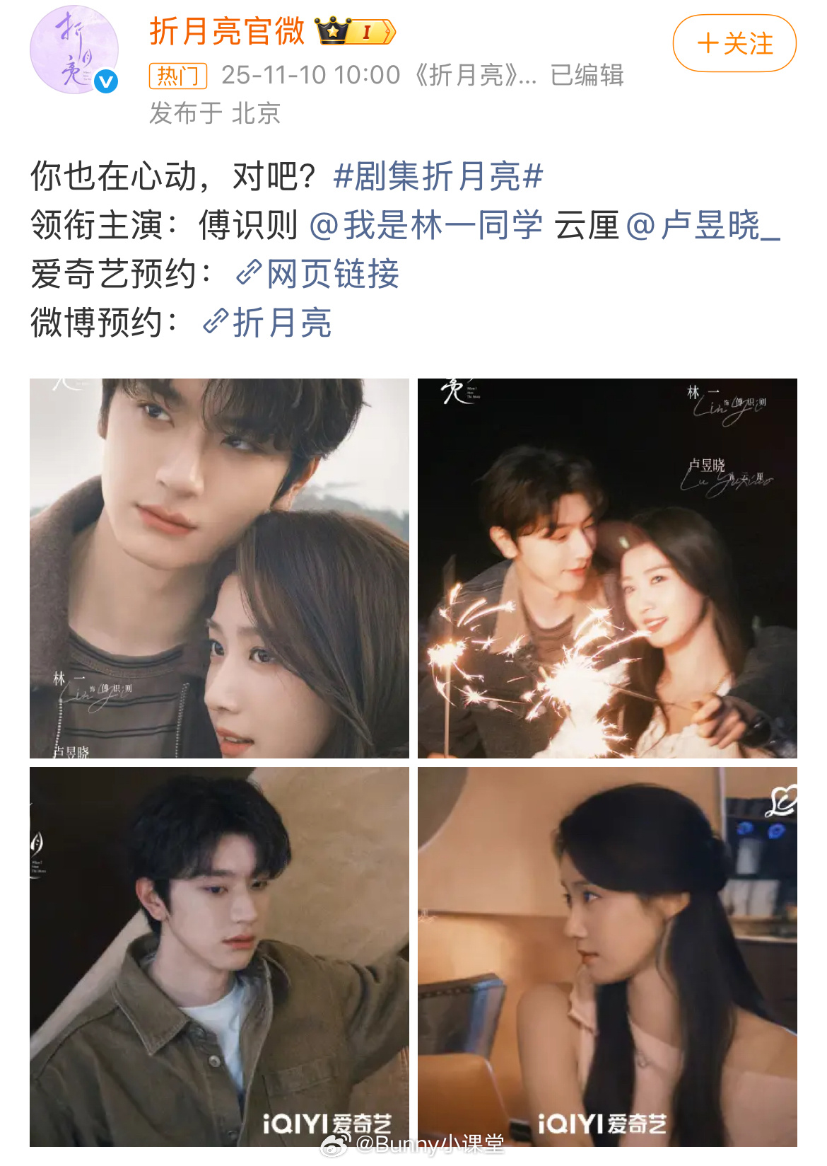 折月亮官微公布最新海报,粉丝指出预览图林一出画,官微反应过来迅速调整,结果现在女主卢昱晓又被挡了脸……非要用这张海报吗[泪奔]