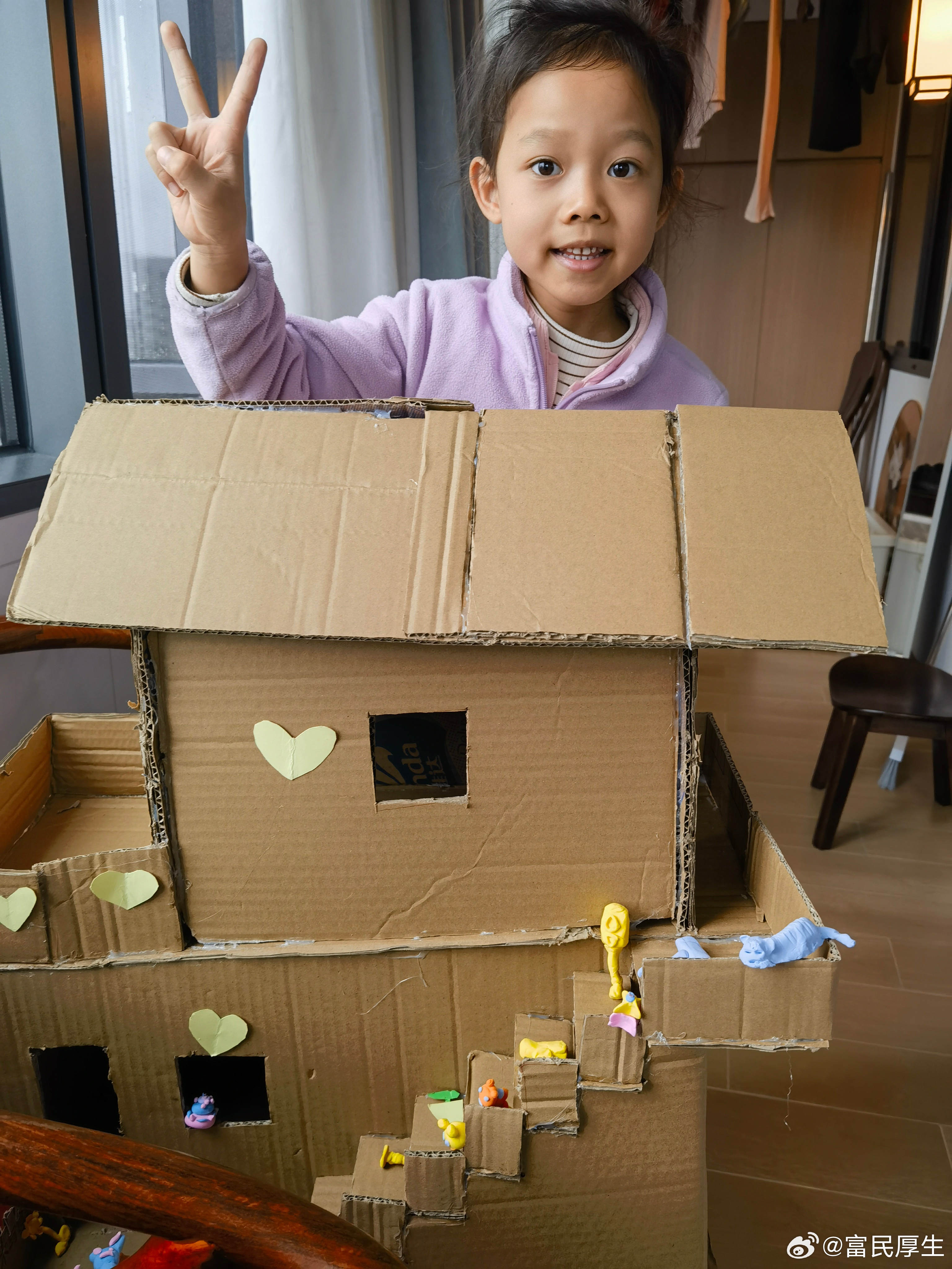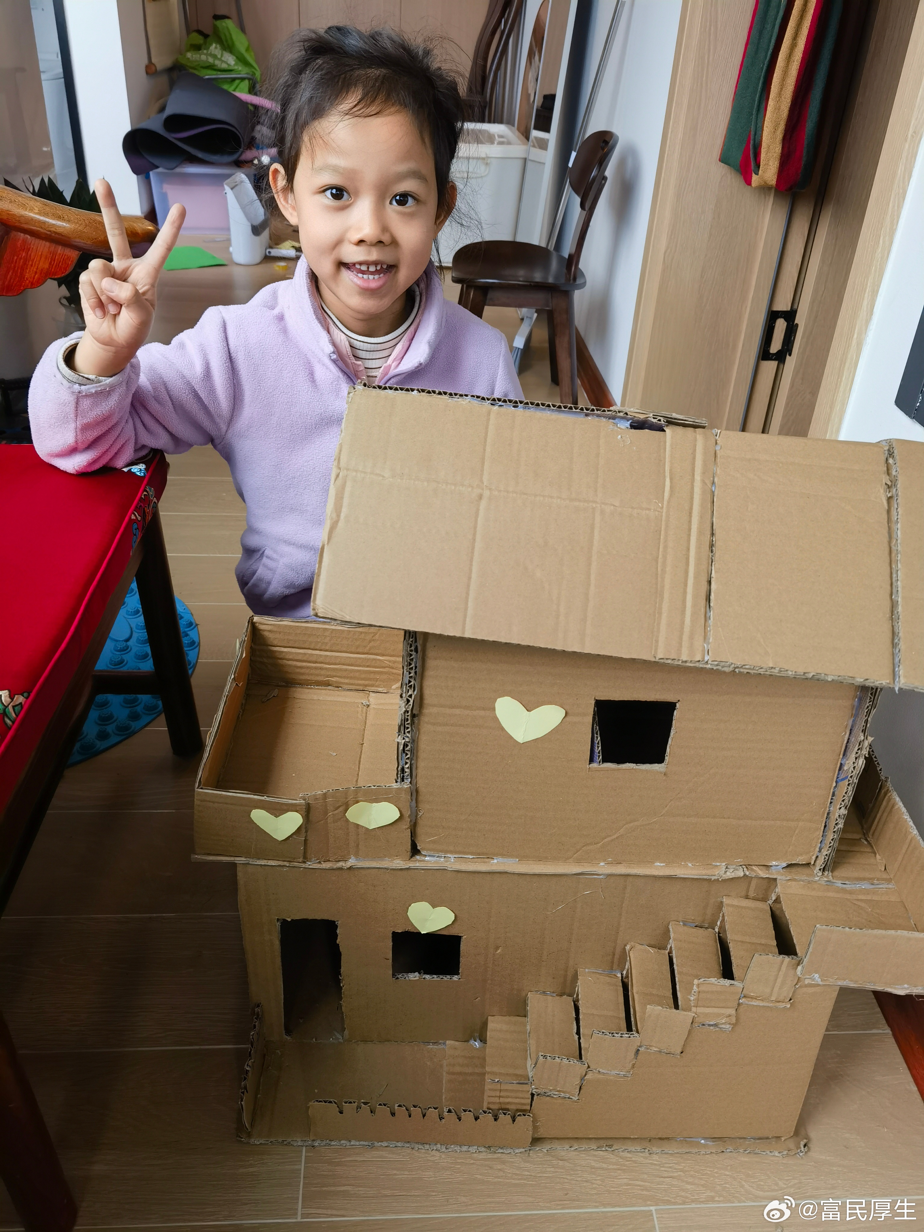我们蹲在地板上用废纸板做手工房子。现在的孩子幸福,材料都是现成的——裁好的纸板、热溶胶水、甚至还有微缩的家具贴纸。月月只需要按图纸拼装,就像搭积木。可她偏不,非要自己设计窗户的位置,还要在屋顶画几只飞鸟。