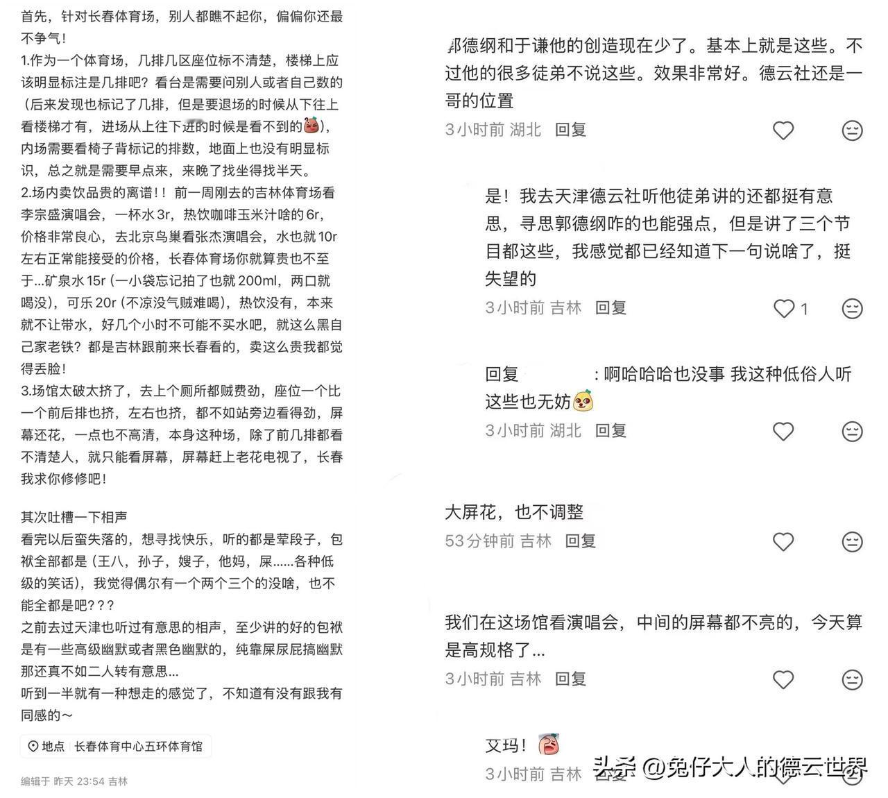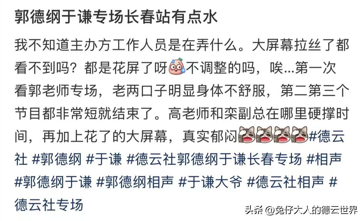 郭德纲、于谦长春专场很火爆,有不少观众在小红书给出了最真切的感受。演出观感,可以分为两个方面,一个是场馆给的,一个是演员给的。场馆设备能跟上,环境、音响、服务等都非常到位,这对演出是有很强的辅助性的。但是,从现场观众的讲述来看,似乎不太行。演员方面,这就难说了。众口难调,有的喜欢这样的调侃、砸挂,有的不喜欢。所以,能够保证绝大多数观众听得进去,这就足够了。