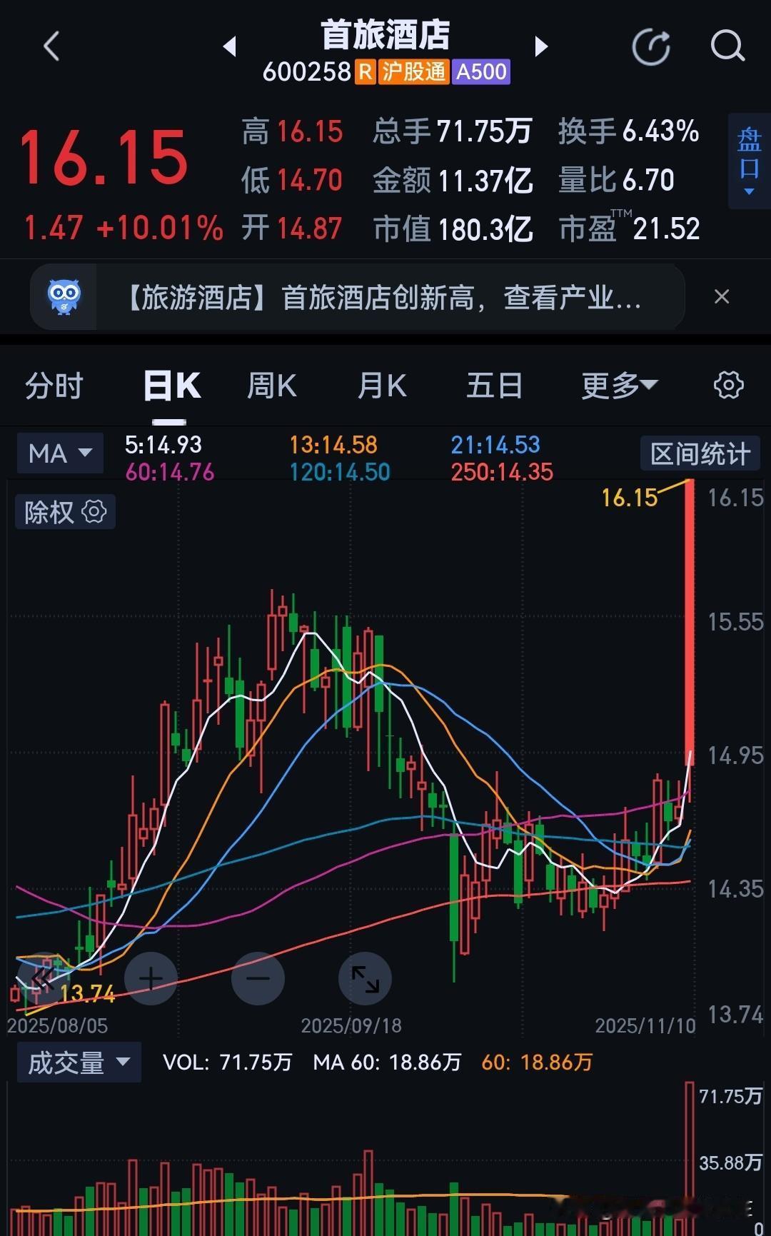 首旅酒店的主力我能“问候”你吗?难道你们就盯着我的三瓜两枣筹码吗?我不卖出你就不张,我一卖出,你们乘机拉升。😭 9.19日,想着国庆假期,旅游酒店会有一波消费潮,节后会迎来板块上涨。于是抱着短线赚一波跑路的打算,15.4元买入了5800股。谁承想,买入后就连续下跌,国庆节后开盘第一天没有迎来期望的上涨,却迎来了大跌。 既然被套了,那就拿着死扛吧!结果最近一直不涨,始终在14元附近震荡。上周五实在无法忍受了,14.75元全部卖出了。 结果今天周一,大家都看到了,首旅酒店涨停收盘!真的气死我了,这主力太会玩了,专盯着我这个小散这58手筹码吗? 幸亏卖出的首旅全款买入了华利集团,也迎来了4.52%的上涨📈,否则真的要让我哭晕在厕所了。 请问友友们,难道主力真的盯着我们小散的一举一动吗?大家遇到过这种情况吗? 股市分析