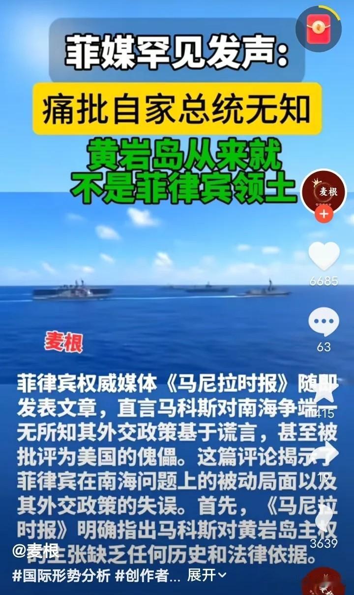 菲律宾自家媒体都看不下去了!发文痛批自己的总统无知,因为黄岩岛从来就不是菲律宾领土。 菲律宾权威媒体《马尼拉时报》发文称:“小马对南海的归属权一无所知,在南海频繁发动争端,这是在别人利用,在为美国做傀儡”。 确实,你要说黄岩岛是菲律宾的,那可真是无从稽考。因为黄岩岛自古以来就是属于中国的,在东汉时期我们就发现了该岛并命名。在1947年,我们还进行过更名,叫"民主礁",并且将该岛划入中沙群岛。到了1983年,我们正式将“民主礁",命名为黄岩岛。在今年,2025年,我们更是设立该岛为国家级自然保护区。 而菲律宾呢?就把一条破船搁浅在此,就妄想着与中国争夺黄岩岛等附近岛屿归属权。这下连他们自家媒体,自己人民都看不下去了。
