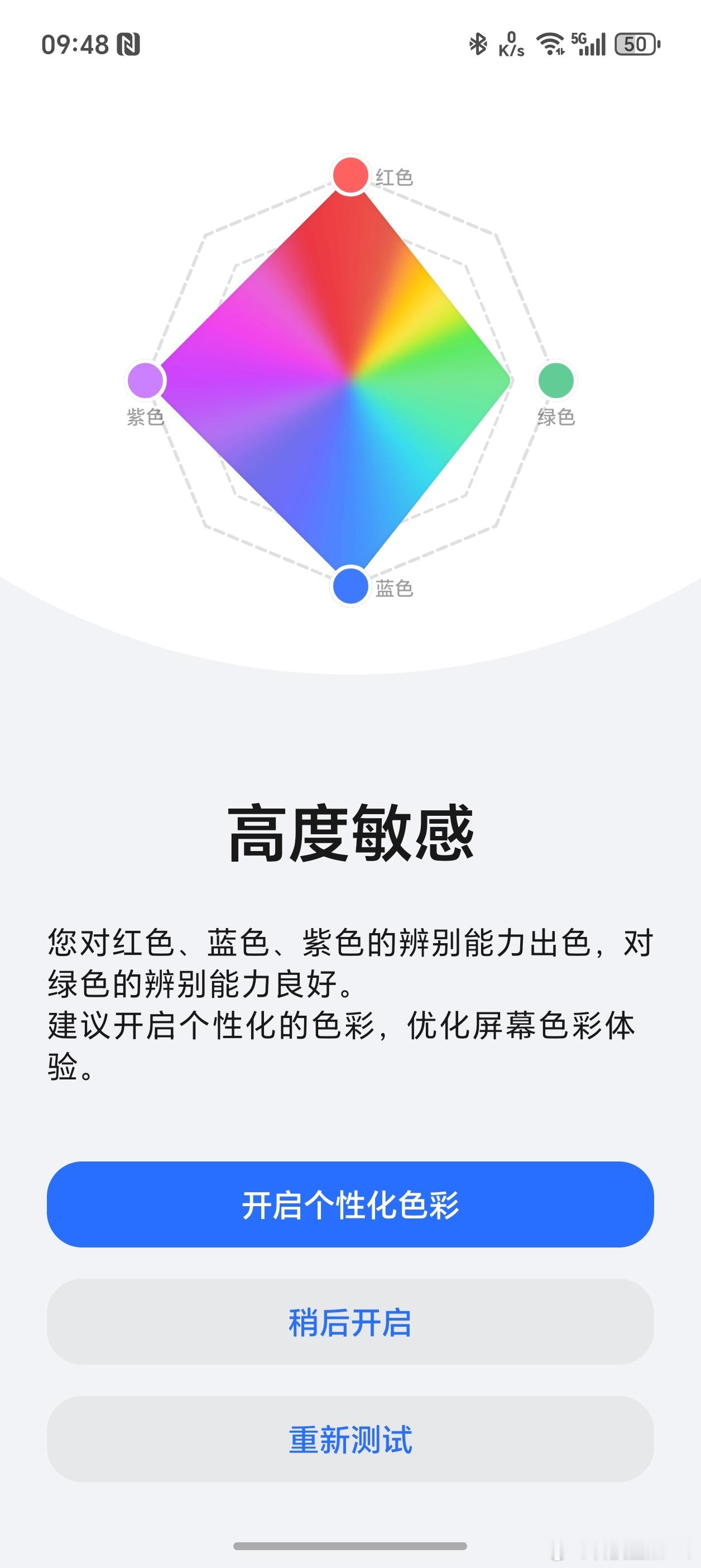 我做了下色觉测试,对红色、紫色、蓝色的辨别非常敏感,绿色不如以上三个颜色敏感,各位Magic8机友们可以试试,看看有没有全色都优秀的[doge]