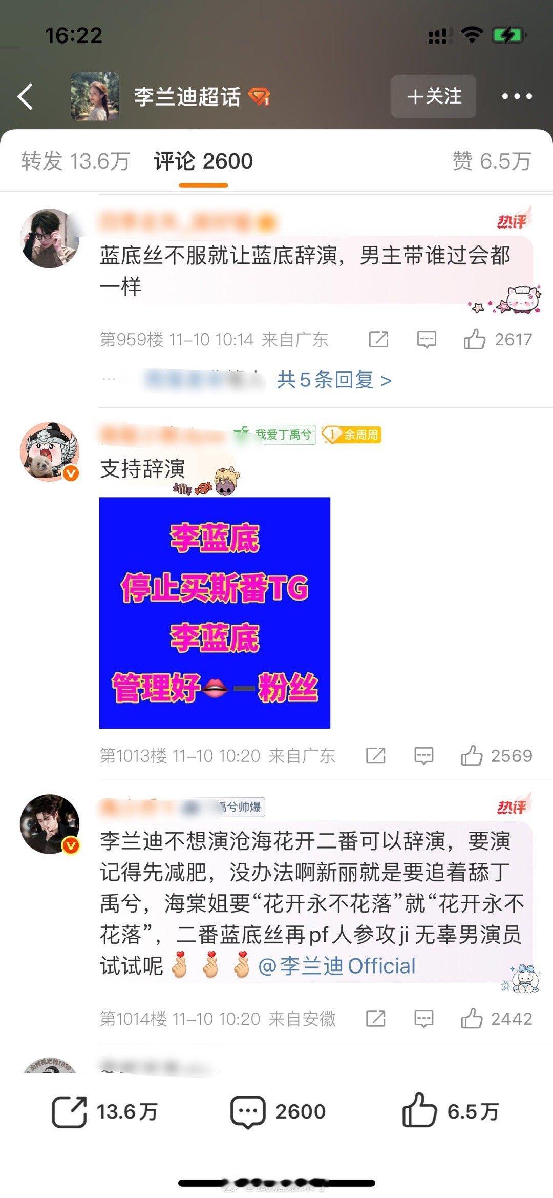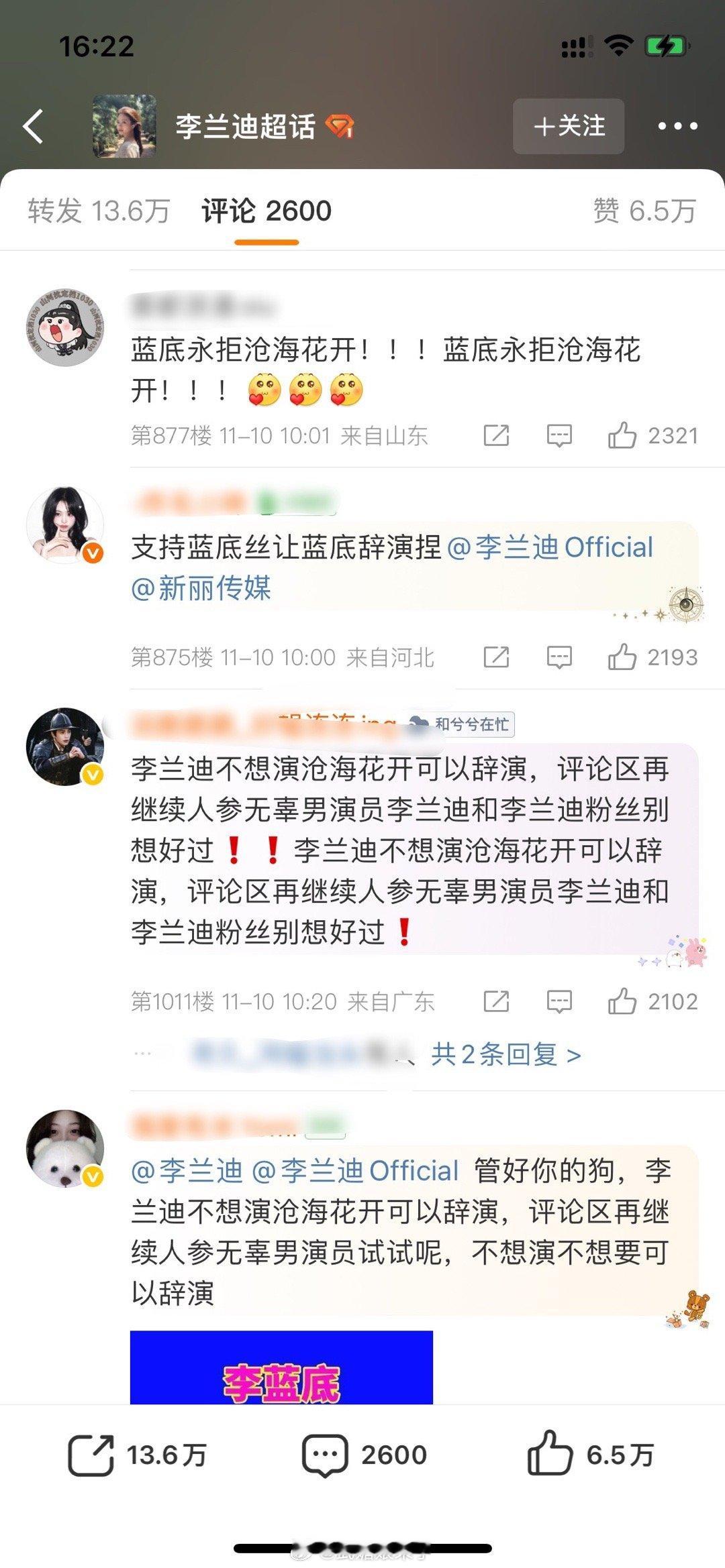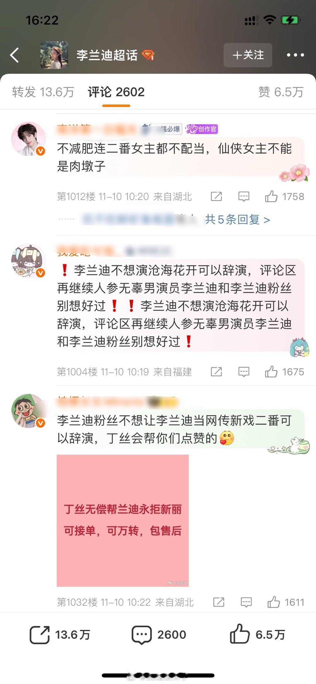 丁禹兮粉丝因为《沧海花开》番位问题图了李兰迪工作室评论区