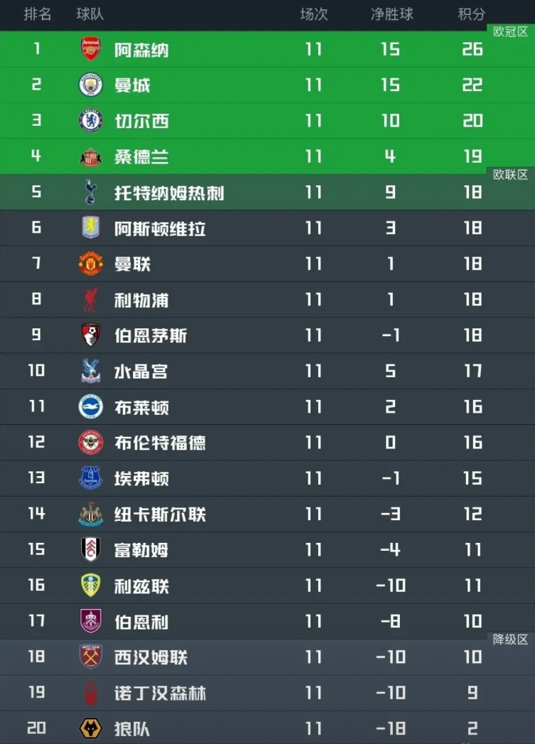 英超11轮后最新积分榜出炉,看完排名我有四点感慨!