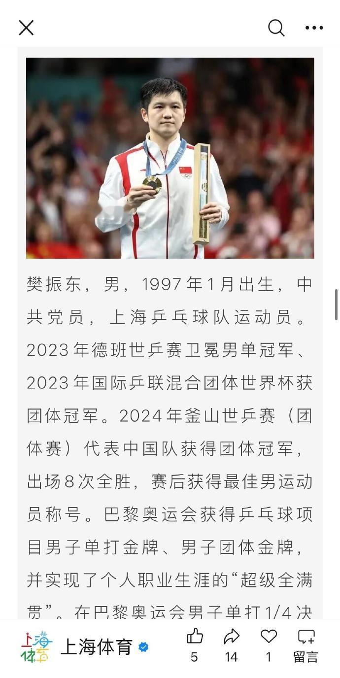 樊振东,上海乒乓球队运动员。2023年德班世乒赛卫冕男单冠军、2023年国际乒联混合团体世界杯获团体冠军。2024年釜山世乒赛(团体赛)代表中国队获得团体冠军,出场8次全胜,赛后获得最佳男运动员称号。巴黎奥运会获得乒乓球项目男子单打金牌、男子团体金牌,并实现了个人职业生涯的“超级全满贯”。在巴黎奥运会男子单打1/4决赛中,樊振东临危不乱,以“越是艰险越向前”的豪迈气概连扳四局,展现了顽强拼搏、坚定自信的竞技面貌。樊振东用自己的实际行动诠释着“国球精神”,他不仅是一位杰出的乒乓球运动员,更是一位充满责任感的青年典范,积极参与社会活动,展现出中国体育健儿“使命在肩、奋斗有我”的担当和“祖国至上、团结协作”的精神力量。