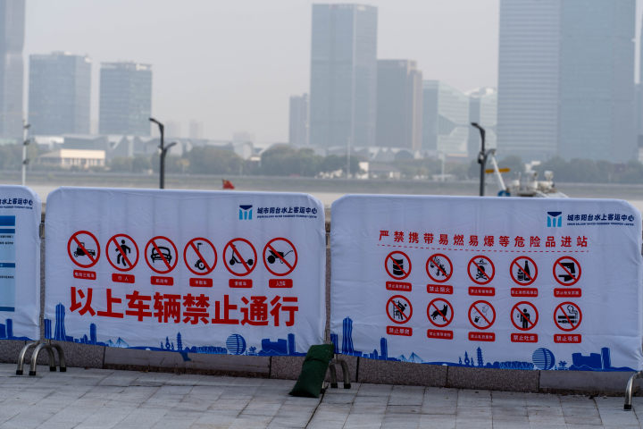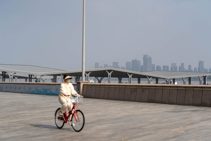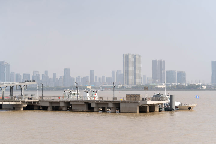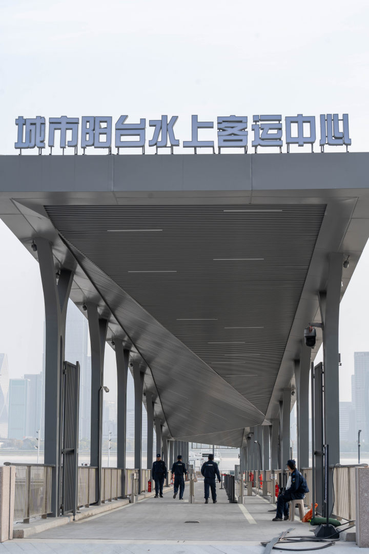 今天下午。从城市阳台进入江堤步道,渡轮码头就在靠近香隐钱塘的旁边。现场正在进行最后的收尾打扫工作。乘船须知和指示牌都已经摆放到位。