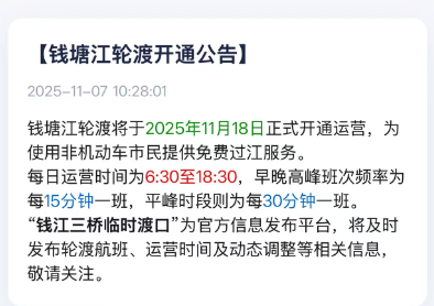 钱江三桥封闭施工后,市民朋友可选择复兴大桥、彭埠大桥等现有通道绕行。此外,在钱塘江两岸分别设立了临时渡口,作为陆路交通的补充。轮渡实行免费政策,将于2025年11月18日起正式投入运营。