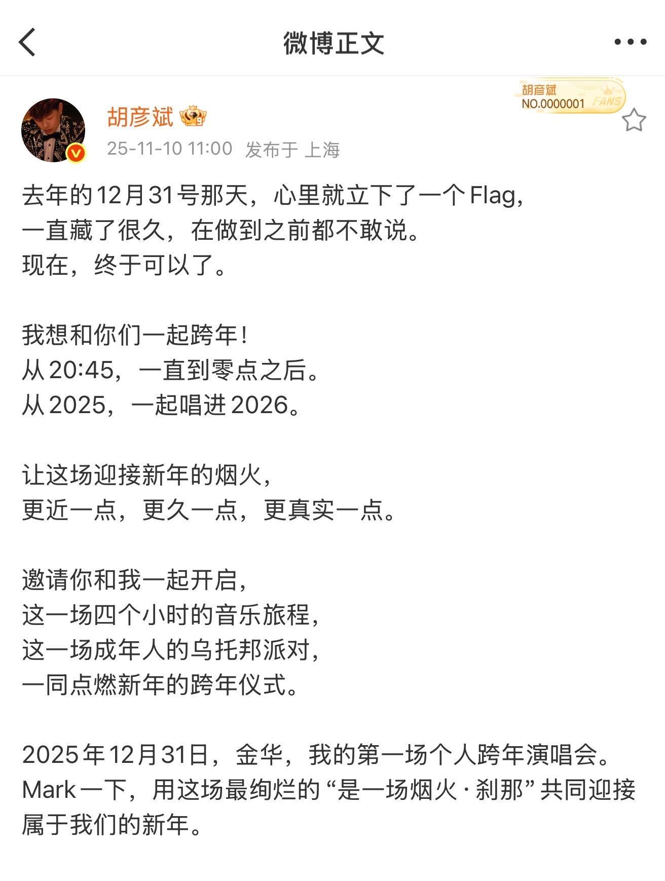胡彦斌首场个人跨年演唱会 藏了一年的惊喜终于来啦!胡彦斌官宣金华首场个人跨年演唱会,20:45开唱嗨到2026零点后,四小时音乐乌托邦太顶了~ 兑现音乐承诺,金曲连唱+绚烂舞台,年末最炸狂欢等你赴约!