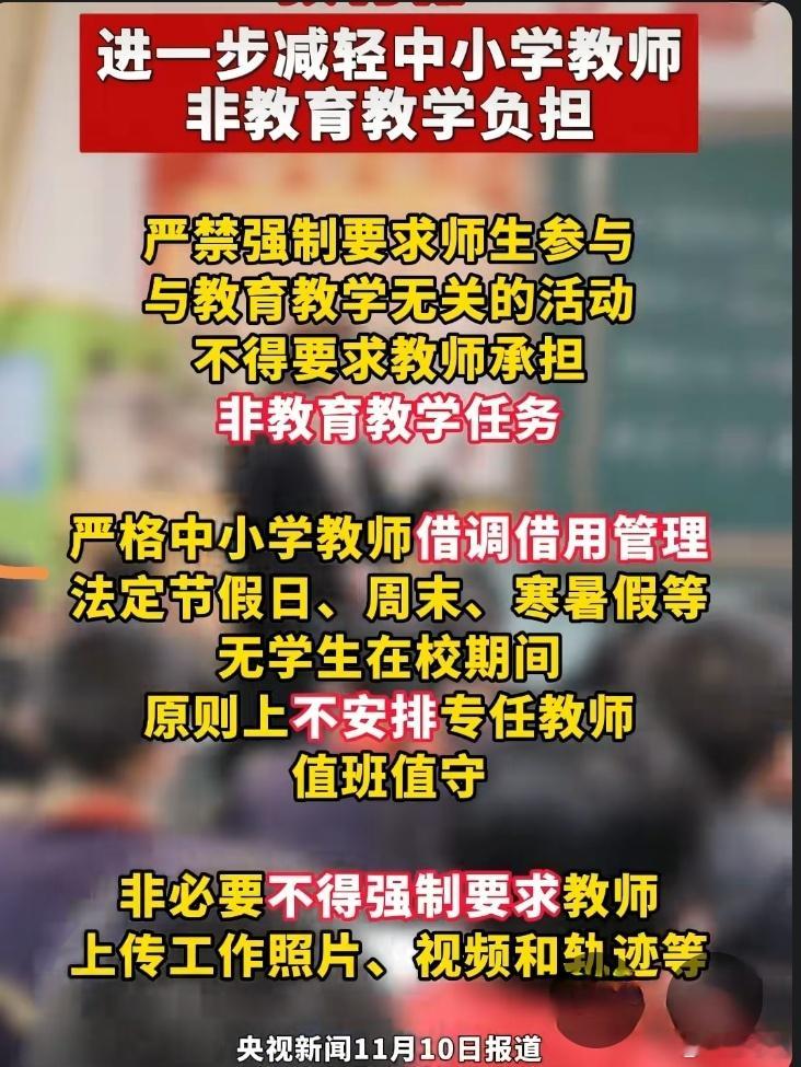 不得要求教师承担上街执勤等任务现在除了畜牧局还没给老师摊派任务,其他所有的局都能对老师发号施令,这好像不是一句玩笑话。现在中小学老师绝大部分精力用来做和教学无关的事,能坐下看会教材、研究教学成了最幸福的事,期盼早日实现教师真正减负!给教师减负势在必行,只有卸下那些不必要的重担,才能让老师好好教书用心育人,才能让教育回归纯粹本质。热点观点