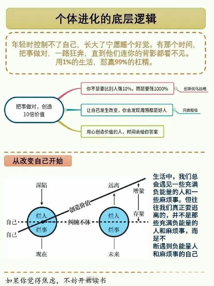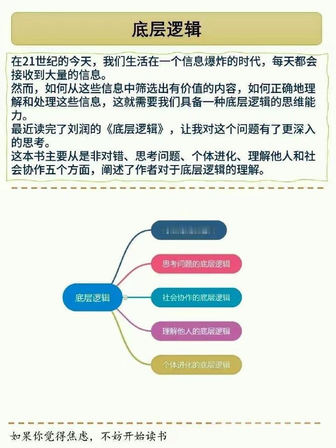 据说这是一位职场高手总结出来的,读完《底层逻辑》,将里面的内容浓缩成了9页PPT,简单来说,就是六个方向,对错的底层逻辑、思考问题的底层逻辑、社会协作的底层逻辑、理解他人的底层逻辑以及个体进化的底层逻辑。建议大家保存下来,没事多看看,这本书主要是从是非对错、思考问题、个体进化、理解他人和社会协作等五个方向,能把这9页PPT搞懂,你将会有一个新的改变。#MCN双量进阶计划##寻美三湘##长沙新朋友# 底层逻辑:看清这个世界的底牌 刘润著 学习底层逻辑启动开挂人生