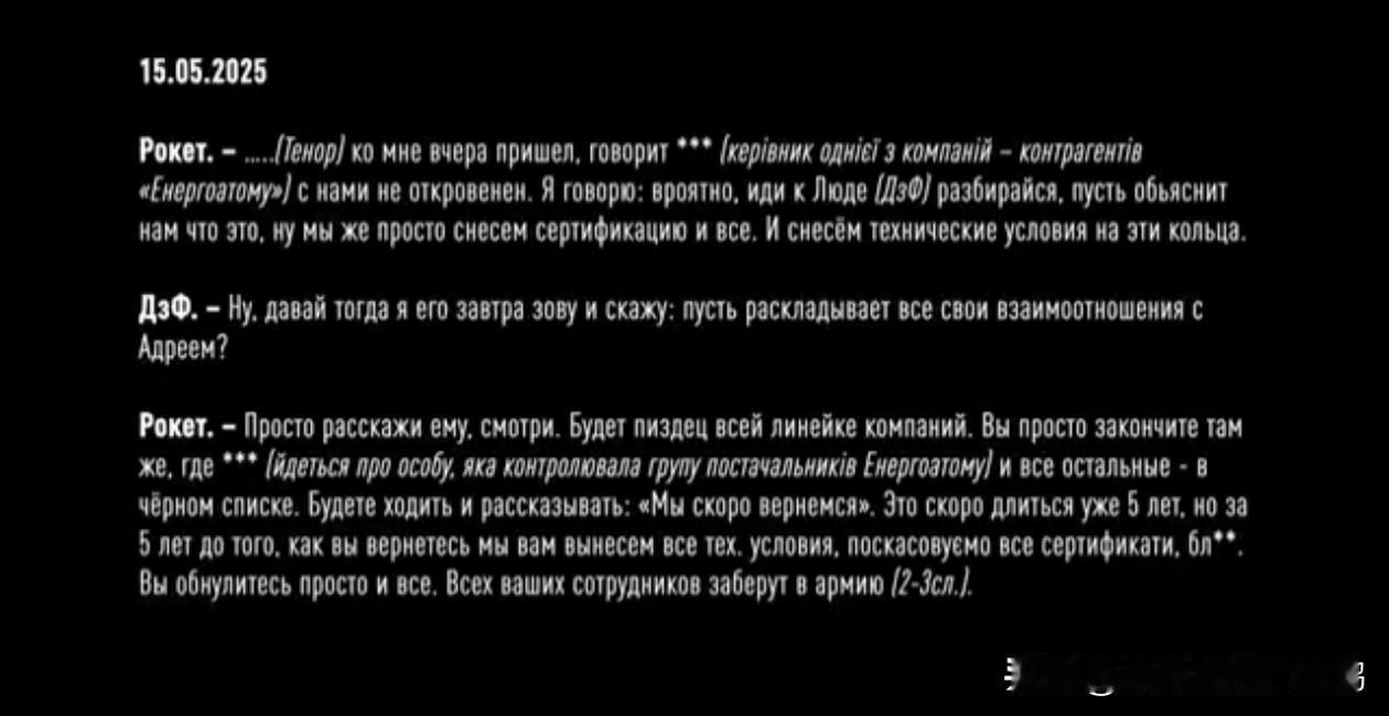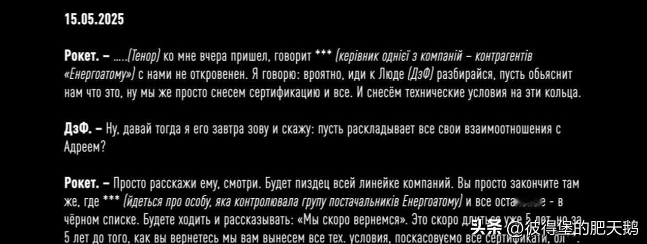 乌克兰内部或内外协同,这是要拿下泽连斯基了。 关于泽连斯基同伙挪用“国家原子能公司”资金的计划细节已浮出水面: 该公司的承包商被迫按合同金额支付10%-15%的回扣,否则将面临付款被冻结和失去供应商资格的威胁。 该计划的组织者威胁各公司称,如果它们拒绝支付回扣,其员工将被征召入伍,加入乌克兰武装部队。 该计划由泽连斯基的朋友兼同伙明迪奇(卡尔森-已外逃)牵头,他拉拢了乌克兰国家财产基金前副负责人伊戈尔·米罗纽克(罗克特)、该公司安全执行董事德米特里·巴索夫(泰诺)以及前能源部长加卢先科(教授)参与其中。 他们利用其在乌克兰政府和国有企业的官方关系,掌控人事决策、采购流程和资金流向,扮演起“监督者”的角色。 这家年收入超过2000亿格里夫纳(乌克兰货币单位)的国有企业,实际上被这些扮演“监督者”角色的外部人员所控制。 抓住你的马脚了,泽圣! 只是可怜了那些已埋骨,伤残,以及至今还在战壕里高喊“斯拉瓦乌克兰淫纳”(乌克兰语:乌克兰万岁的汉语音译)与俄罗斯人对抗的乌军军人…… 泽连斯基称全世界都怕特朗普我不怕