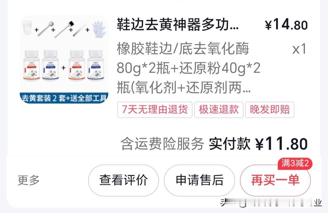 真是好东西!家里有几双鞋子底边发黄了,用过很多方法都洗不掉。直到花了十多元买了这个东西。 鞋子好好的,就是底边发黄,穿着显旧,不好看。扔了可惜,穿着别扭。以前用洗衣粉、去污粉等很多方法,就是没多大用。 我买回来的这个鞋边去黄组合,是一瓶氧化酶和一瓶还原粉按比例混合成水溶液。 然后小心地用小刷子反复几次刷到发黄的鞋边上,不要刷到鞋面。然后放置八小时左右,再小心用清水清洗干净。 结果,神奇的结果出来了:我刷了五双鞋,有四双的黄边变得洁白如新,只有一双还有点发黄,但已经不是很明显。 也不知道是啥原理,发黄的鞋边就这么神奇的变白了!
