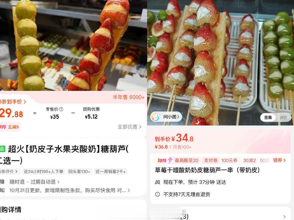 11月10日,潮新闻记者在某外卖平台看到,一款未加干噎酸奶的晴王奶皮子糖葫芦,原价38元,秒杀价格为18.8元,近一周销量1000+,近24小时销量200+;一款奶皮子水果夹酸奶的糖葫芦,原价35元,到手价29.88元,半年销售6000+,近一周销量2000+;最贵的一款奶皮子水果糖葫芦价格为48元。
