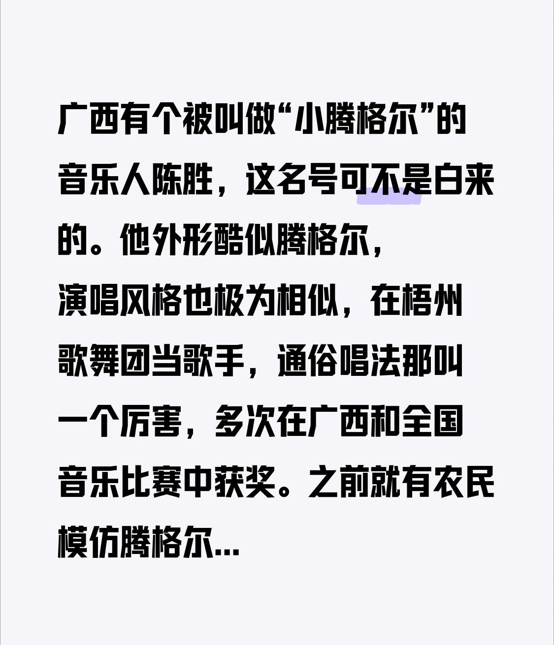 广西有个被叫做“小腾格尔”的音乐人陈胜,这名号可不是白来的。他外形酷似腾格尔,演唱风格也极为相似,在梧州歌舞团当歌手,通俗唱法那叫一个厉害,多次在广西和全国音乐比赛中获奖。 之前就有农民模仿腾格尔唱《天堂》,能把本尊都看傻,这相似度可想而知。陈胜也是如此,凭借着独特的外形和演唱风格出圈。而且他还不满足于音乐领域,跨界经营“巴马天城”音乐餐吧,把家乡巴马的美食和音乐文化融合在一起,这多元的艺术人生,属实让人佩服!