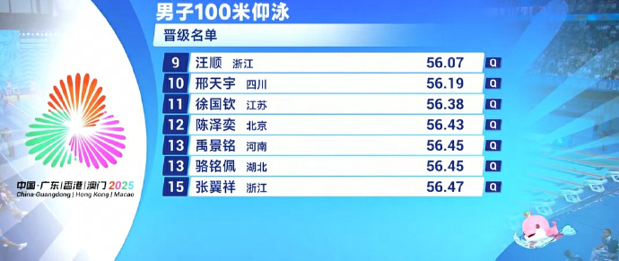 汪顺第一组出发56.07,成绩位列所有选手第9,两人都顺利挺进半决赛。