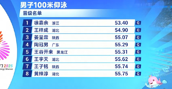 徐嘉余汪顺晋级100仰半决赛徐嘉余100仰预赛第一