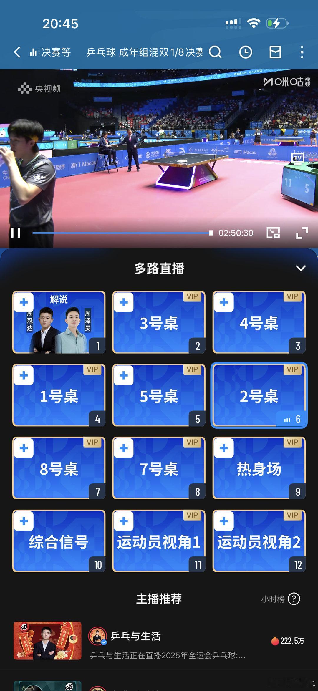 12:30 女单1/8 1号台 孙颖莎vs王晓彤 12:30 男单1/8 2号台
