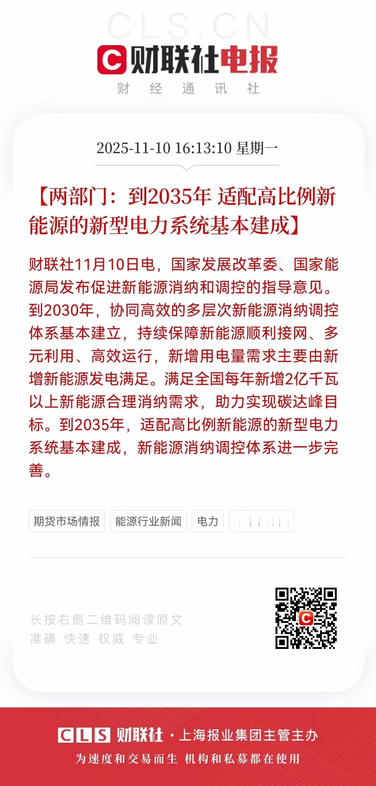 具体来说,到2030年,我国将基本建立协同高效的多层次新能源消纳调控体系,保障新能源顺利接网、多元利用、高效运行,满足全国每年新增2亿千瓦以上新能源的合理消纳需求。到2035年,适配高比例新能源的新型电力系统将基本建成,新能源消纳调控体系进一步完善。