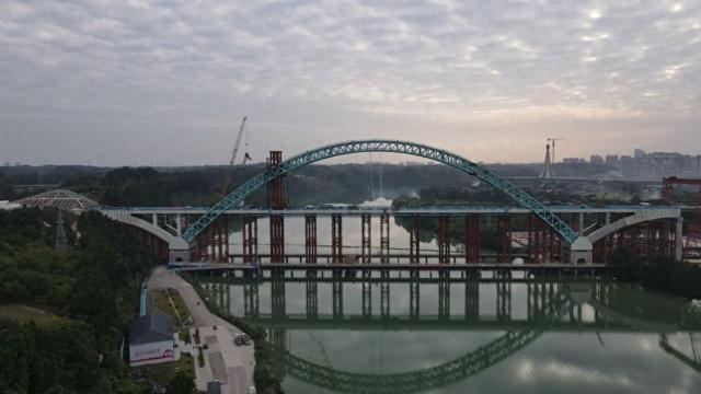 沱江特大桥位于四川省简阳市石钟镇,全长1252米。建设团队突破主拱提升合龙、主梁张拉合龙等难点,形成多项创新成果。