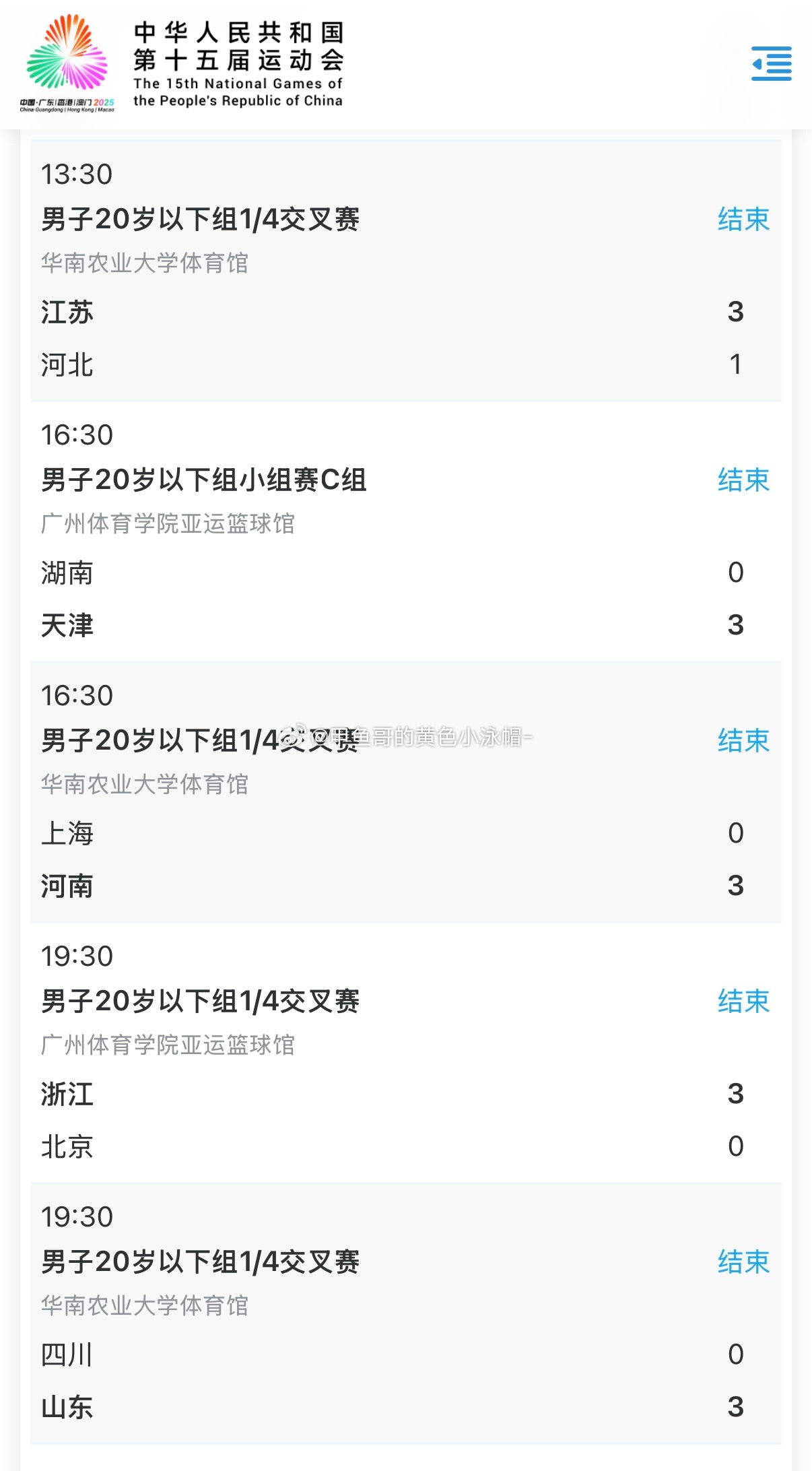 第十五届全运会 U20男排昨天四分之一决赛结果: