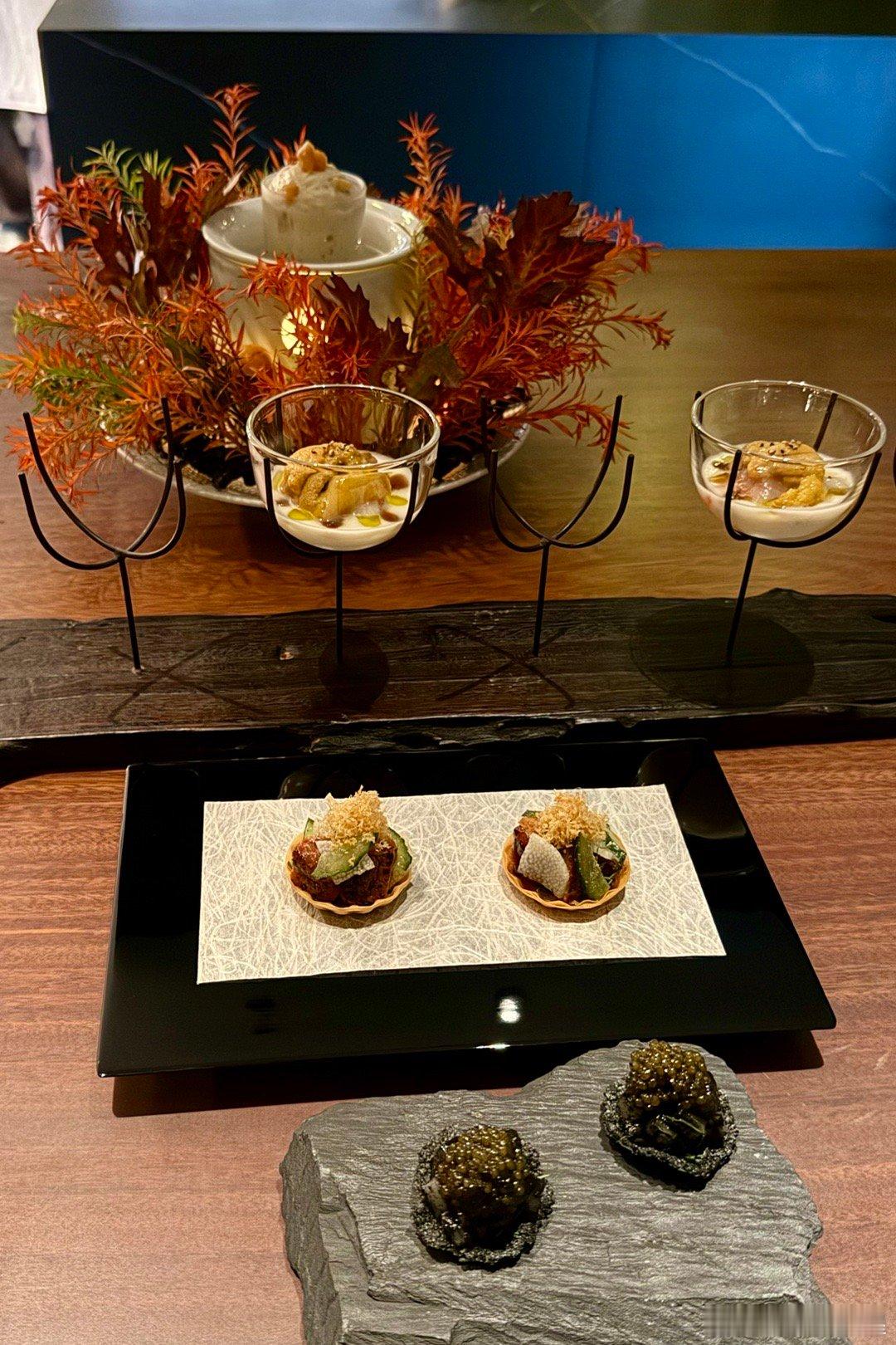 中间是鳗鱼黄瓜塔,咸香口。杯子里是海胆/牡丹虾,拌洋葱酱,是一晚洋葱香的海鲜。