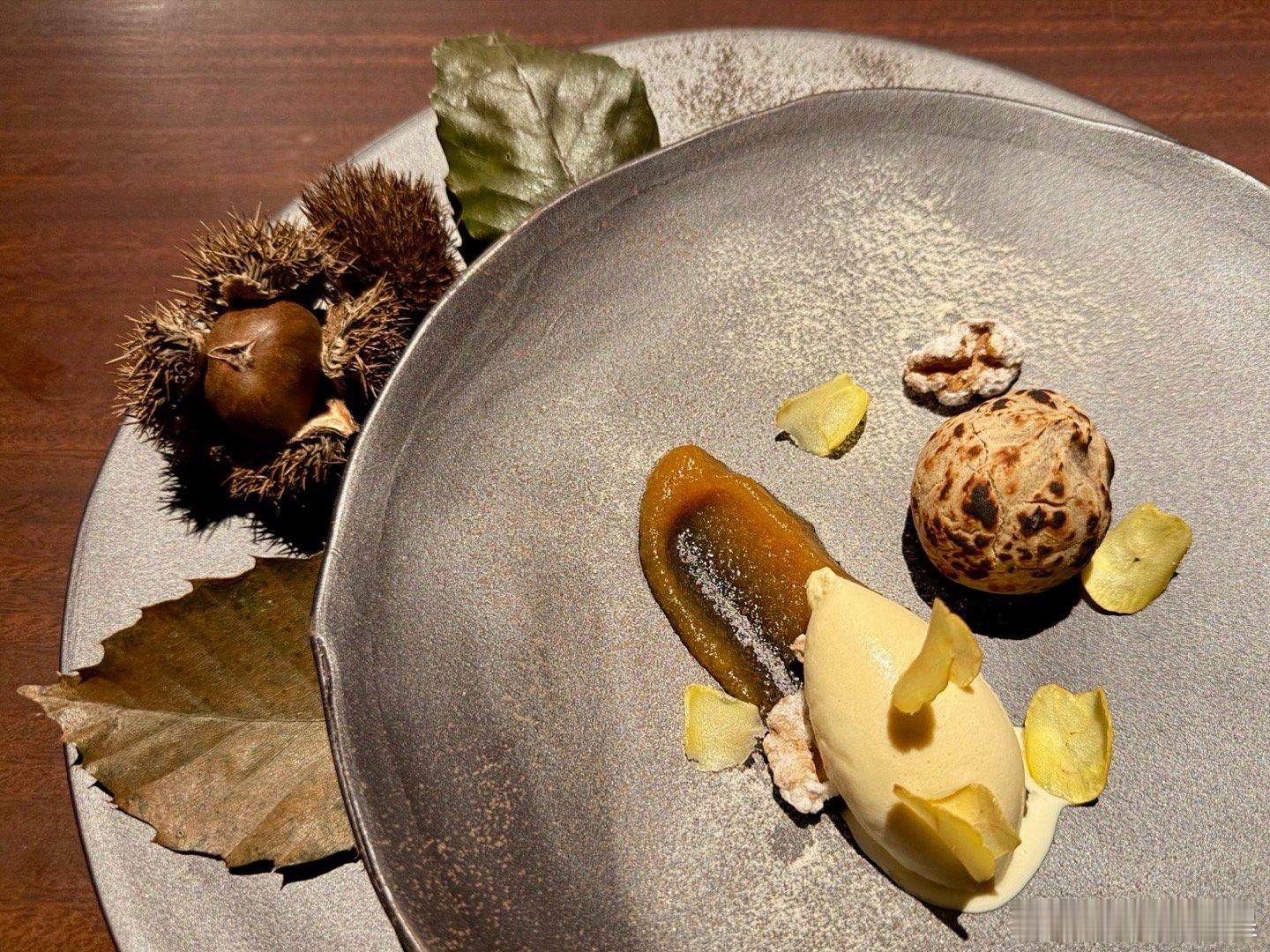 甜品第一道是秋月梨冷汤、牛奶秋月梨蜂蜜冰激凌,配柚子啫喱。一杯很不错的清香甜品。图8是Kavalan威士忌冰激凌,旁边是栗子/和三盆点心,点缀苹果泥,口味是典型的法式甜品。
