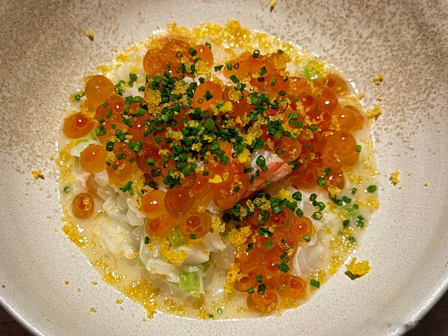 图2是清酒鲍鱼配秋田细稻田乌冬,淡鲜,味道不错。图3是清远鸡汤炖茭白西施贝,很淡的鸡汤,中规中矩。图4是松叶蟹和鮭鱼籽的日式杂炊,味道一般。