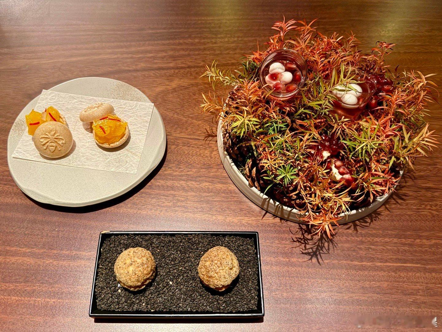 图9是最后的点心,上面是一杯石榴果醋/意式奶冻,酸甜好吃。中间是柑橘最中饼。前面的黑芝麻泡芙很香,不错。