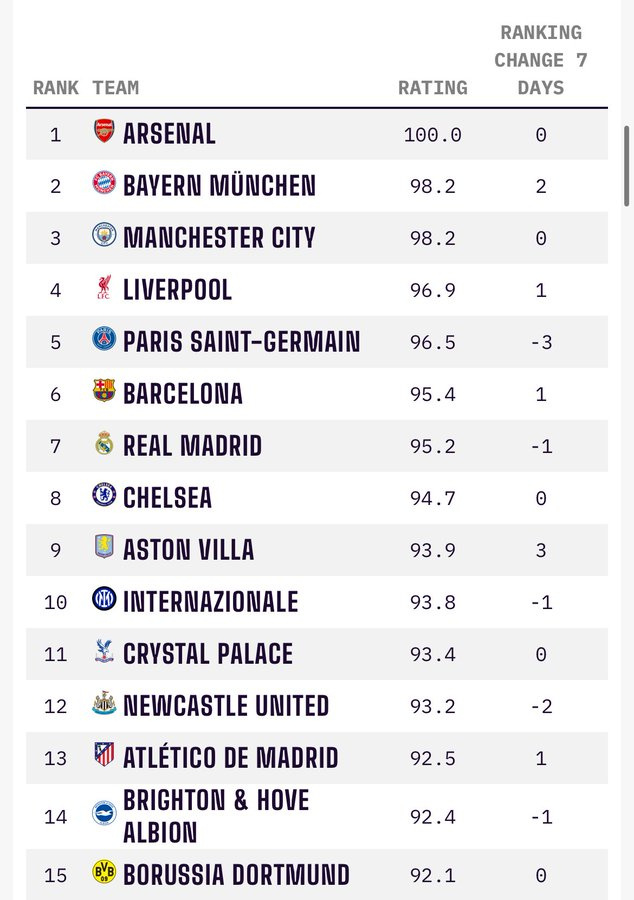 根据Opta的排名,阿斯顿维拉目前位列世界第九。