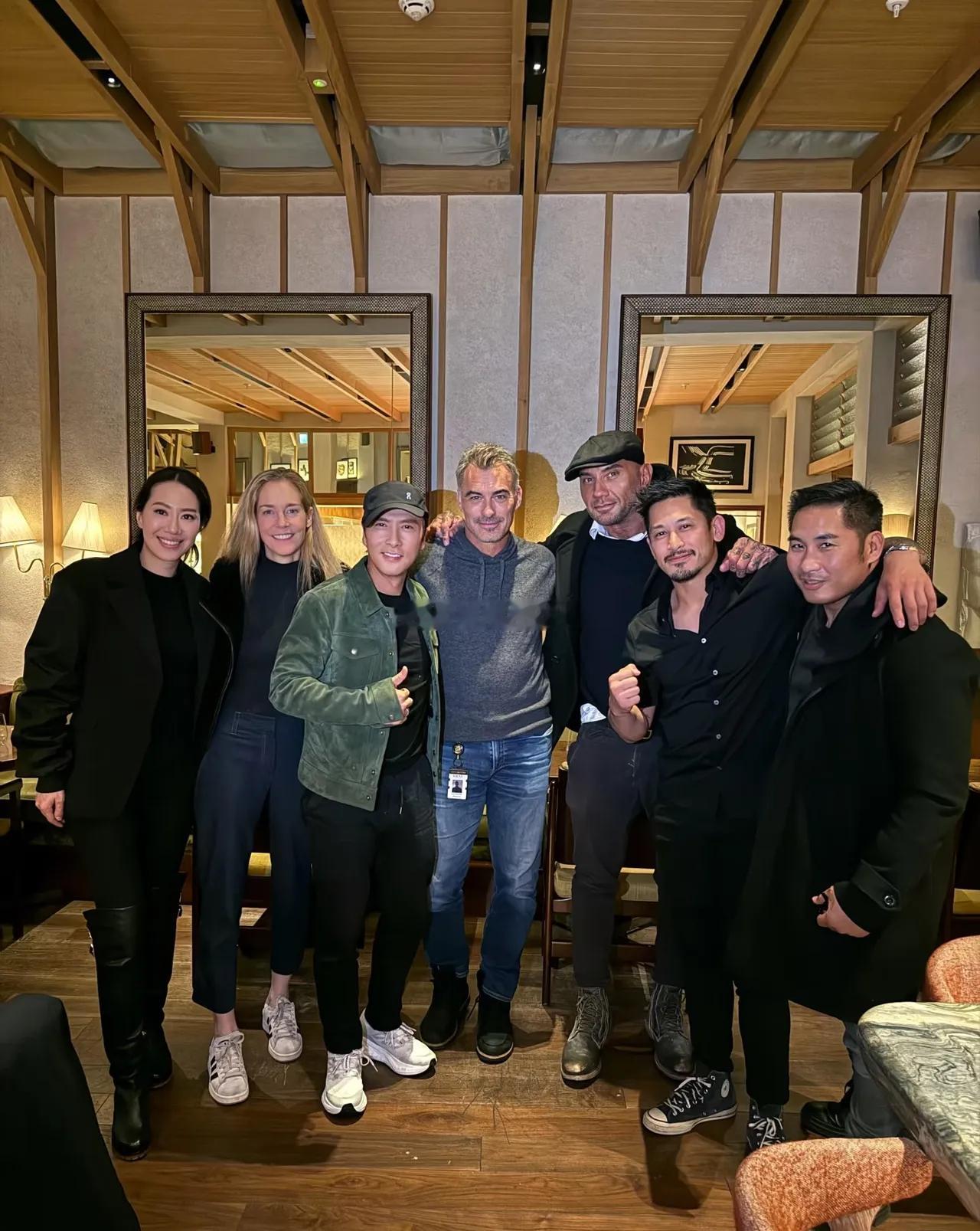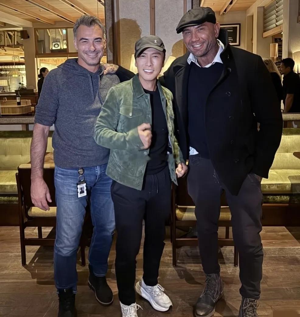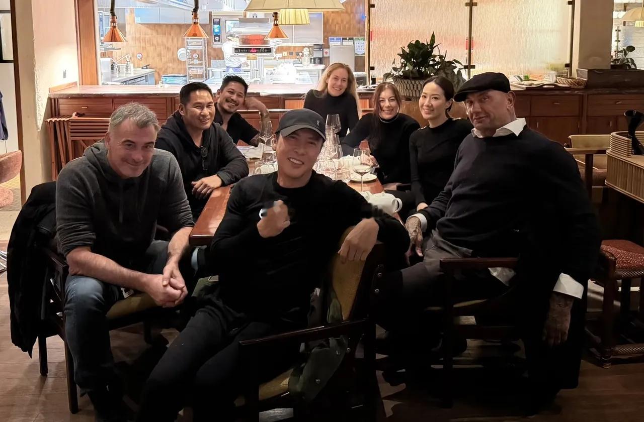 甄子丹现身英国,与查德·斯塔尔斯基、戴夫·巴帝斯塔两位老友相聚,几人围坐在一起相谈甚欢,气氛格外轻松。