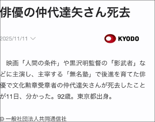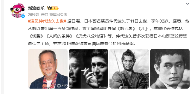 日本著名演员仲代达矢于11日去世,享年92岁。