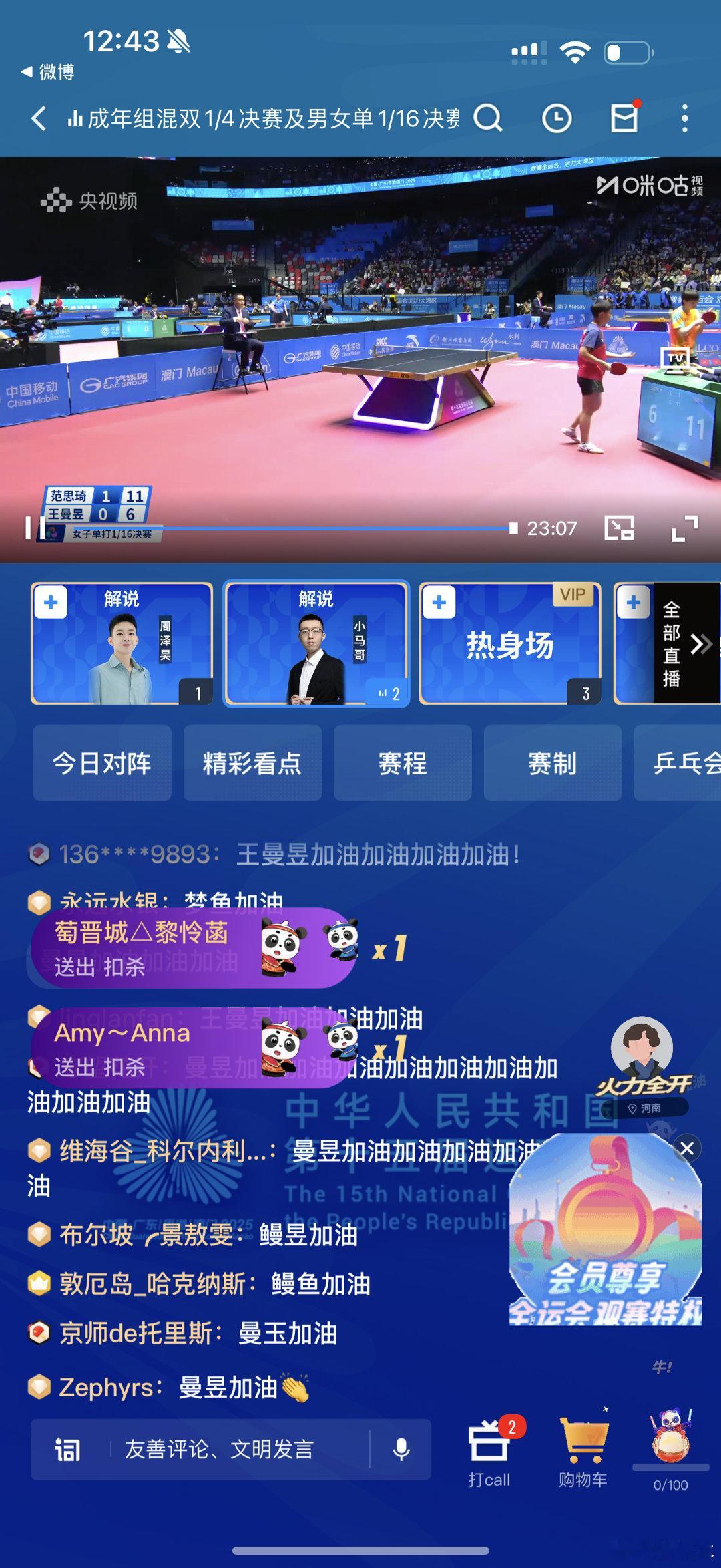 12:30 女单1/8 1号台 孙颖莎vs王晓彤 12:30 男单1/8 2号台