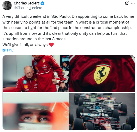 勒克莱尔:“圣保罗非常艰难的一个周末。很失望车队几乎以0分的方式打道回府,这是争夺制造商积分榜第二名的关键时刻。从现在开始,形势很严峻;很显然,只有团结一致才能帮助我们在最后三场比赛扭转战局。我们将一如既往全力以赴。”