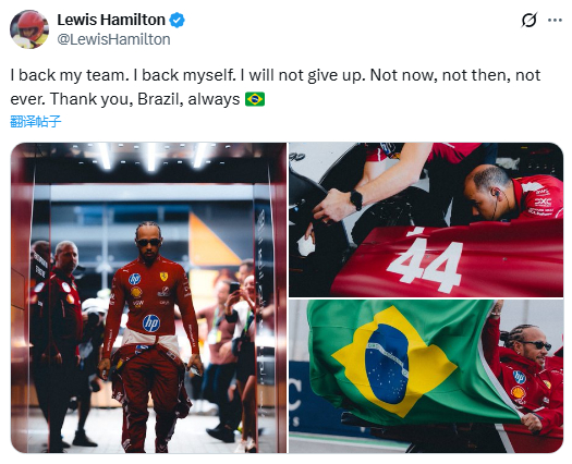 汉密尔顿:“我支持我们车队,支持我自己。我不会放弃,现在不会、曾经不会、永远也不会。谢谢你,巴西,永远如此。”