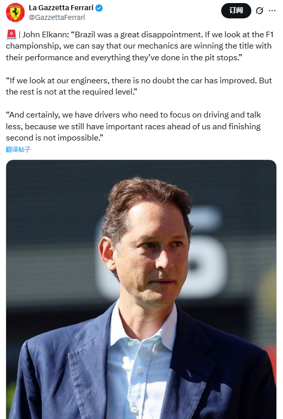 法拉利上一周在巴林WEC赛场上迎来大丰收,F1车队在巴西则遭遇双退,冰火两重天。法拉利主席约翰-埃尔坎措辞很强硬: