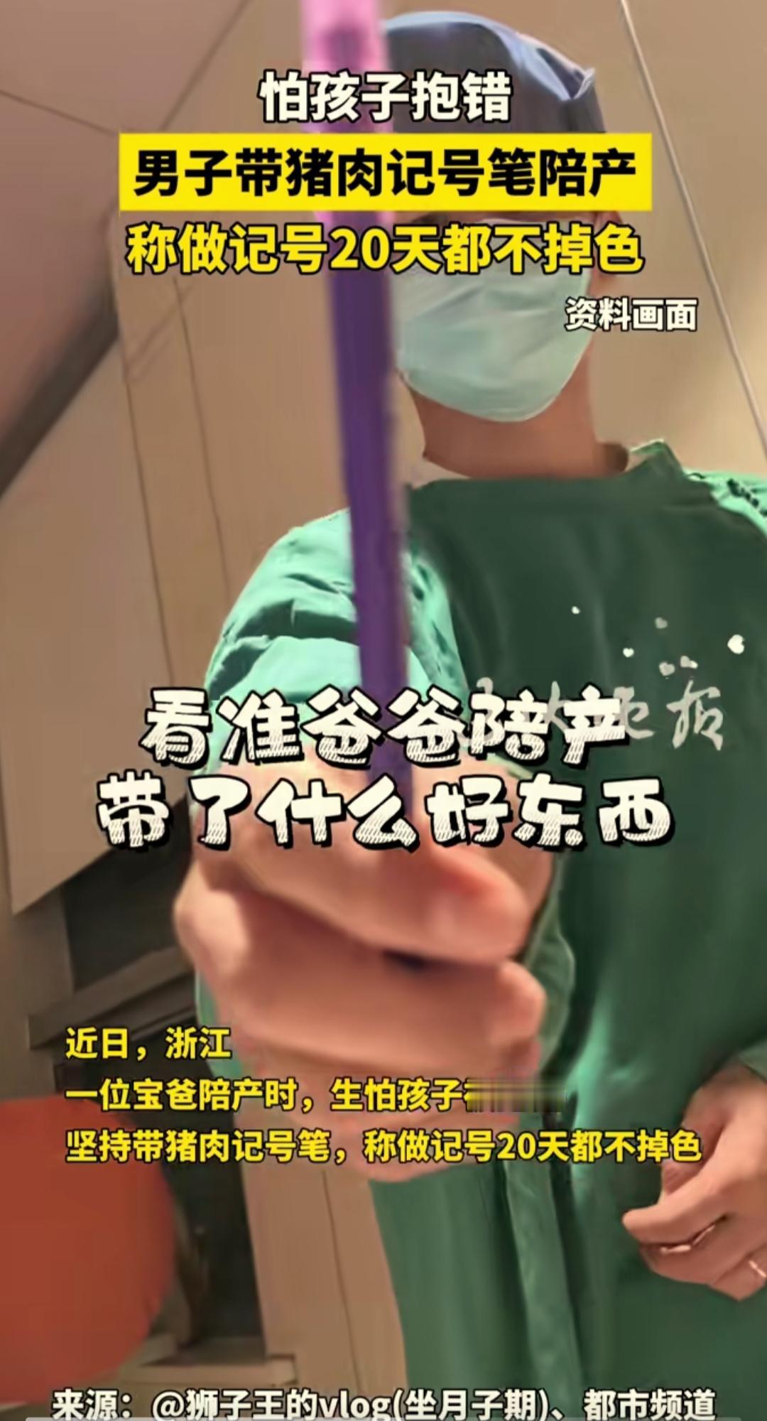 浙江一准爸爸陪产时,怕孩子被抱错,带了一件神器-猪肉记号笔。称给娃做个记号,20天都不会掉色。 虽然看了好笑,但是去医院生产,真的会有这样的顾虑。虽然医院管理严格,但娃只有一个,像电视剧里演的那样,不怕一万就怕万一,万一抱错了,摊到谁身上都是一辈子的心痛。 别看父母老是嫌弃自家孩子这不行那不行的,在父母心里,别家的孩子千好万好,都不如自家的孩子好。 信息来源:辽沈晚报