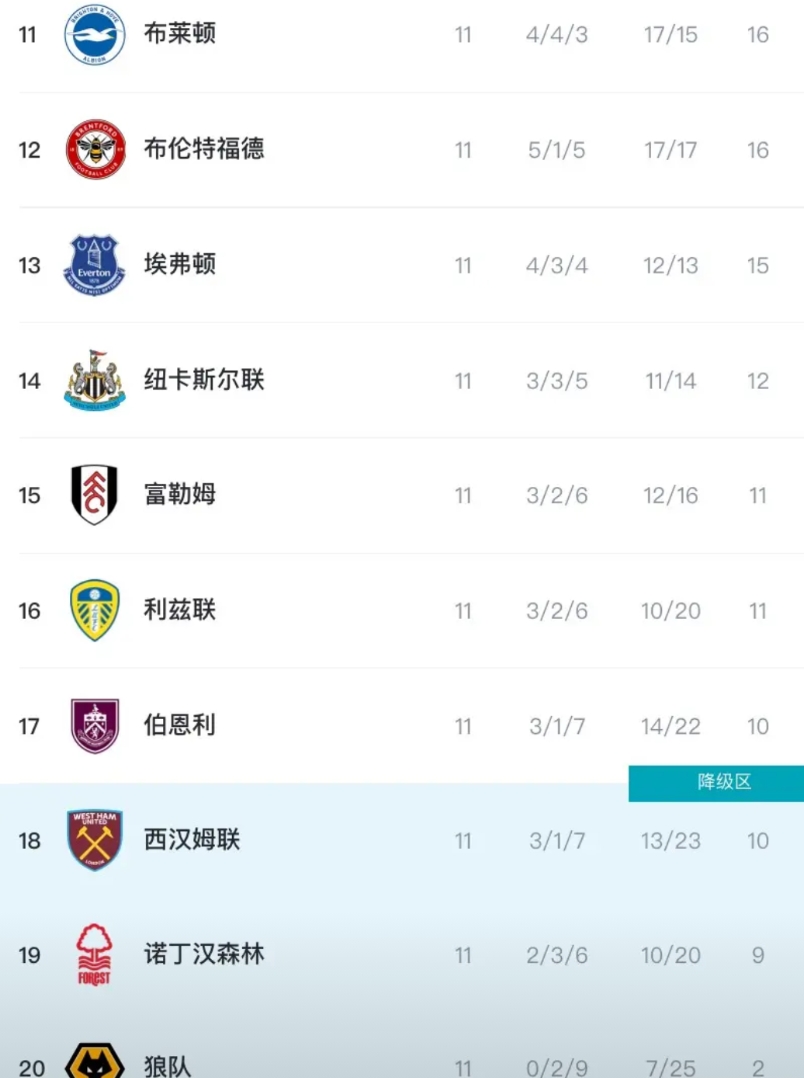 3、保级集团——除了狼队落后太多,其他也有至少5支球队要进行保级,真的太有意思了!