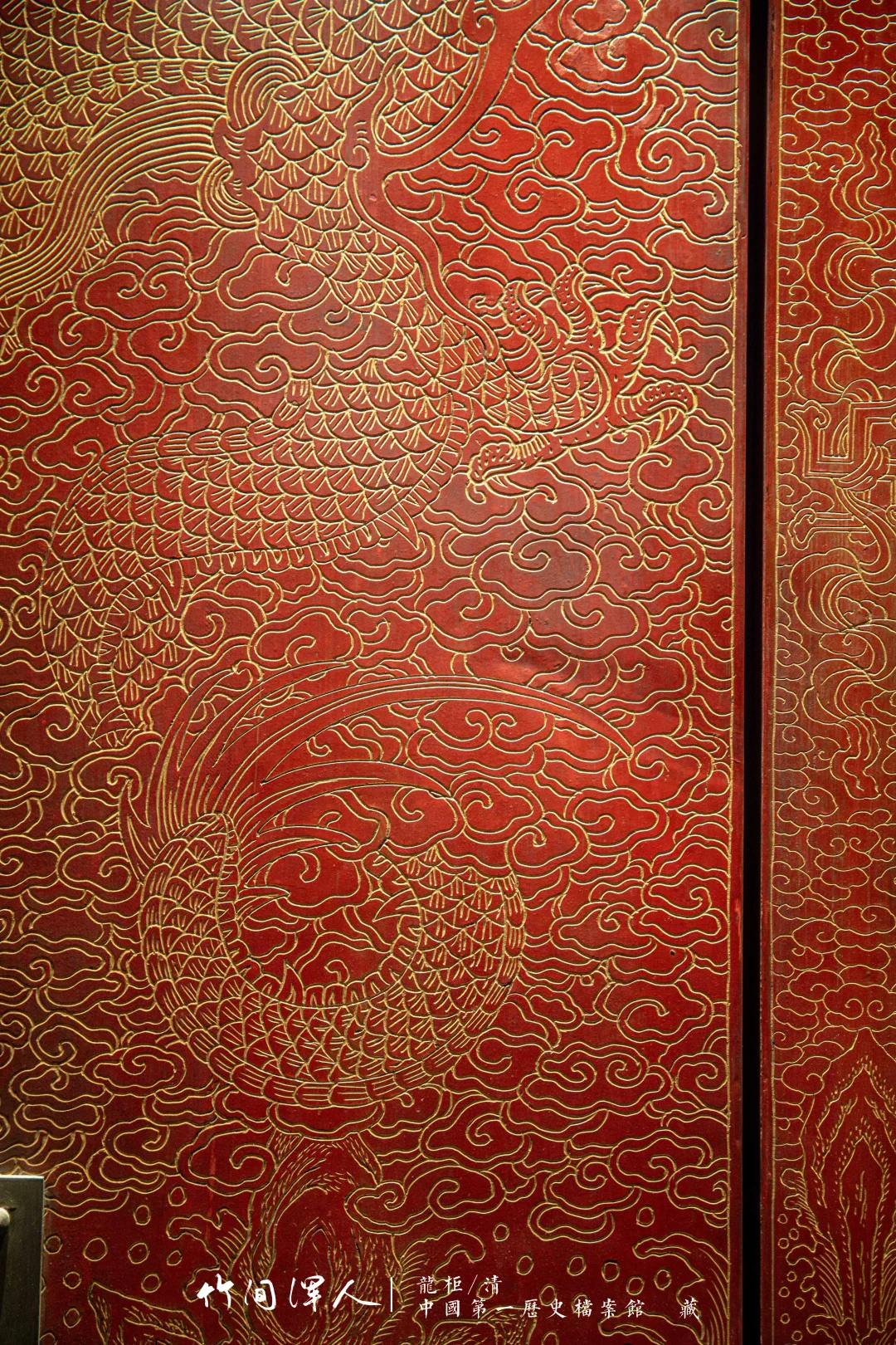 历代王朝都有将国家珍贵典籍藏于“石室金匮”的传统。清代把皇室宗族谱牒存放在龙柜里,每十年修订一次,一开始存放于皇史宬,后来迁到景山寿皇殿两侧的衍庆殿和绵禧殿。龙柜有红黄两种颜色,黄色存放直系皇族(宗室)玉牒,红色存放旁系(觉罗)玉牒,以杉木、松木为主要材质,表面髹漆,柜门对开式,安装有铜质的锁具、把手和合页,龙柜表面以阴刻描金绘制出云龙纹、海水江崖纹等图案。