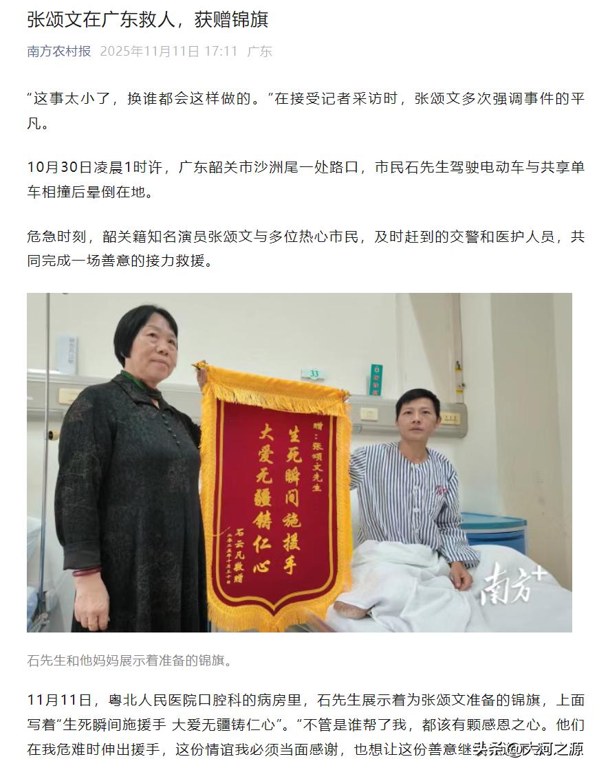 张颂文做好人好事被送锦旗!新闻报道里说张颂文回老家韶关,半夜跟发小开车回家,看到有人摔晕在路边,他们 二话不说就折回去救人。虽然他戴着帽子口罩,还是被医生认出来是《狂飙》里的“强哥”。伤者后来送锦旗,结果发现人家5年前也救过人,真是善有善报!张颂文还一直说“就是件小事”,看!这世界不就是被这些“小事”一点点变好的嘛!“强哥”为你点赞!演员 张颂文 帅气的张颂文 张颂文演技 导师张颂文 对张颂文