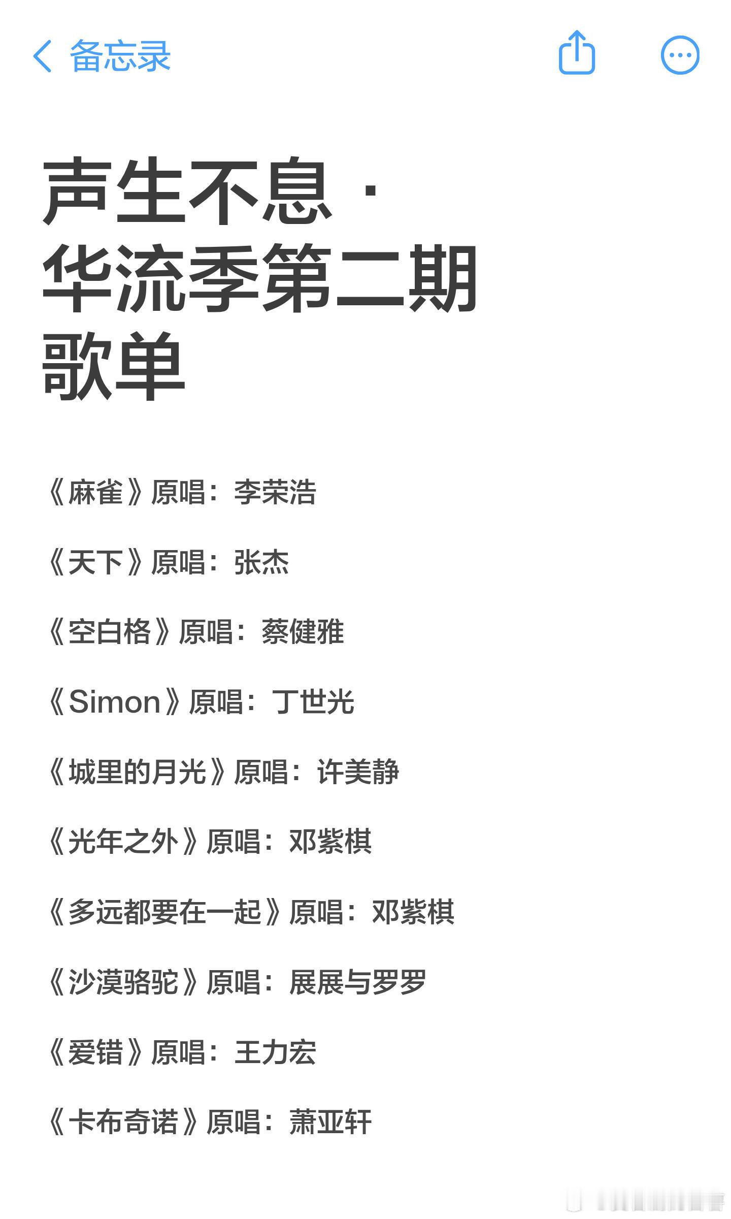 声生不息·华流季第二期歌单《麻雀》原唱:李荣浩《天下》原唱:张杰《空白格》原唱:蔡健雅《Simon》原唱:丁世光《城里的月光》原唱:许美静《光年之外》原唱:邓紫棋《多远都要在一起》原唱:邓紫棋《沙漠骆驼》原唱:展展与罗罗《爱错》原唱:王力宏《卡布奇诺》原唱:萧亚轩声生不息|